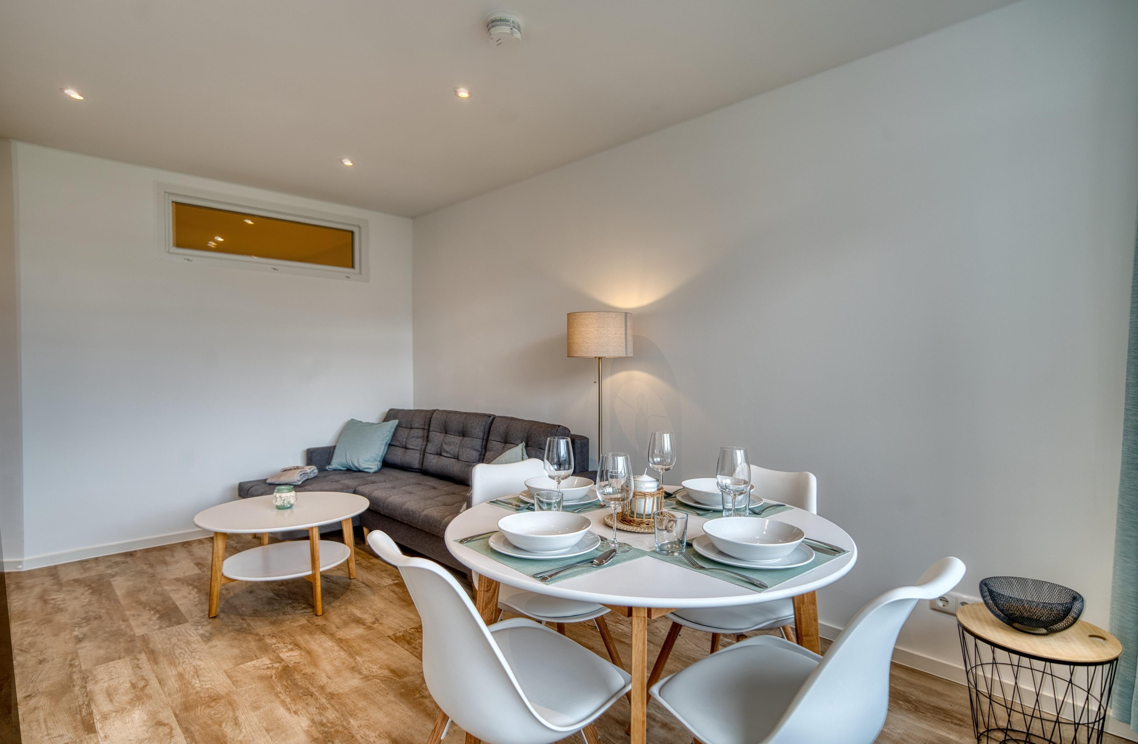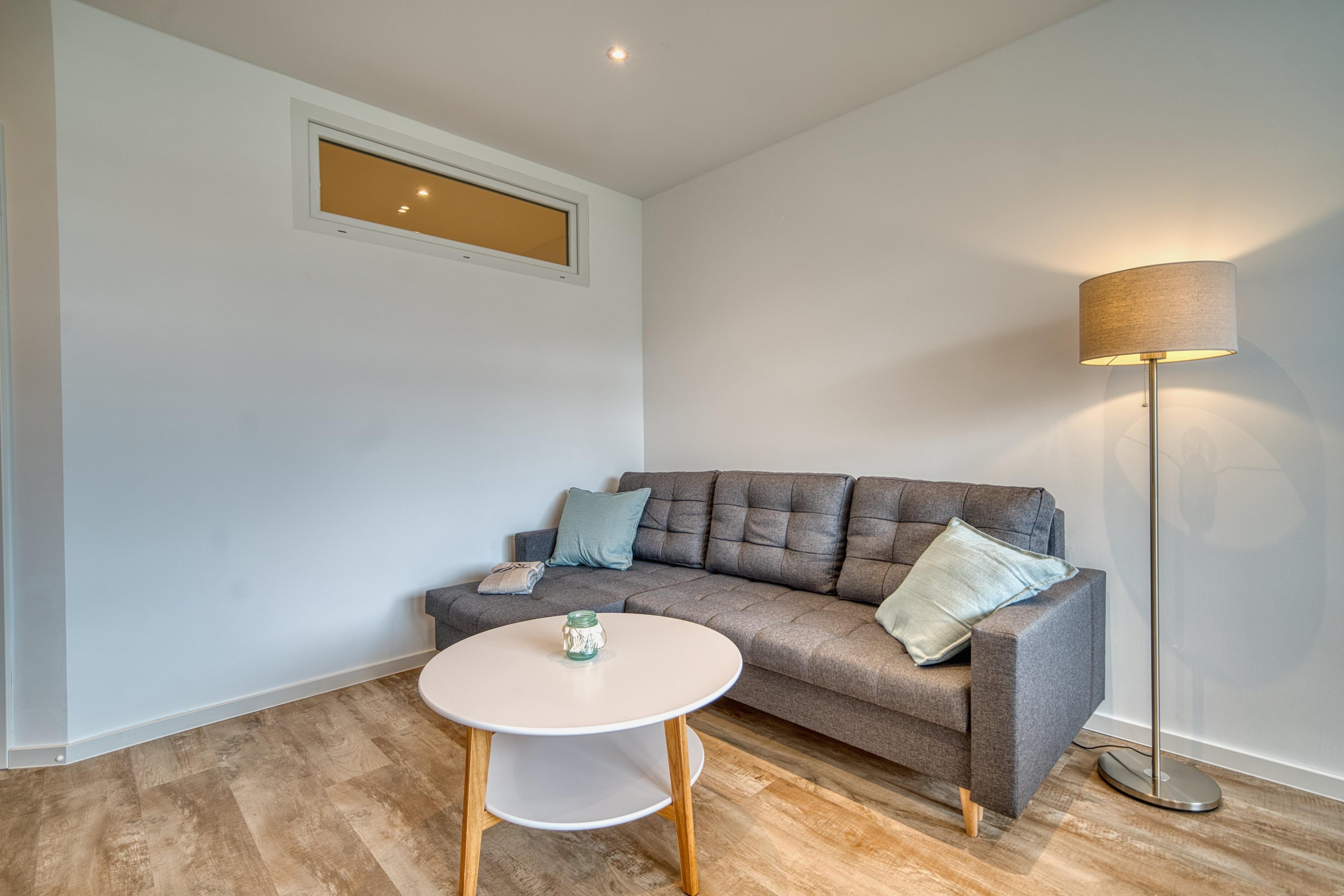 Wohnbereich: Der ansprechende Wohnbereich ist mit einem komfortablen Sofa und einem Smart-TV ausgestattet. Hier können Sie nach einem aktiven Tag an der Ostsee entspannen.