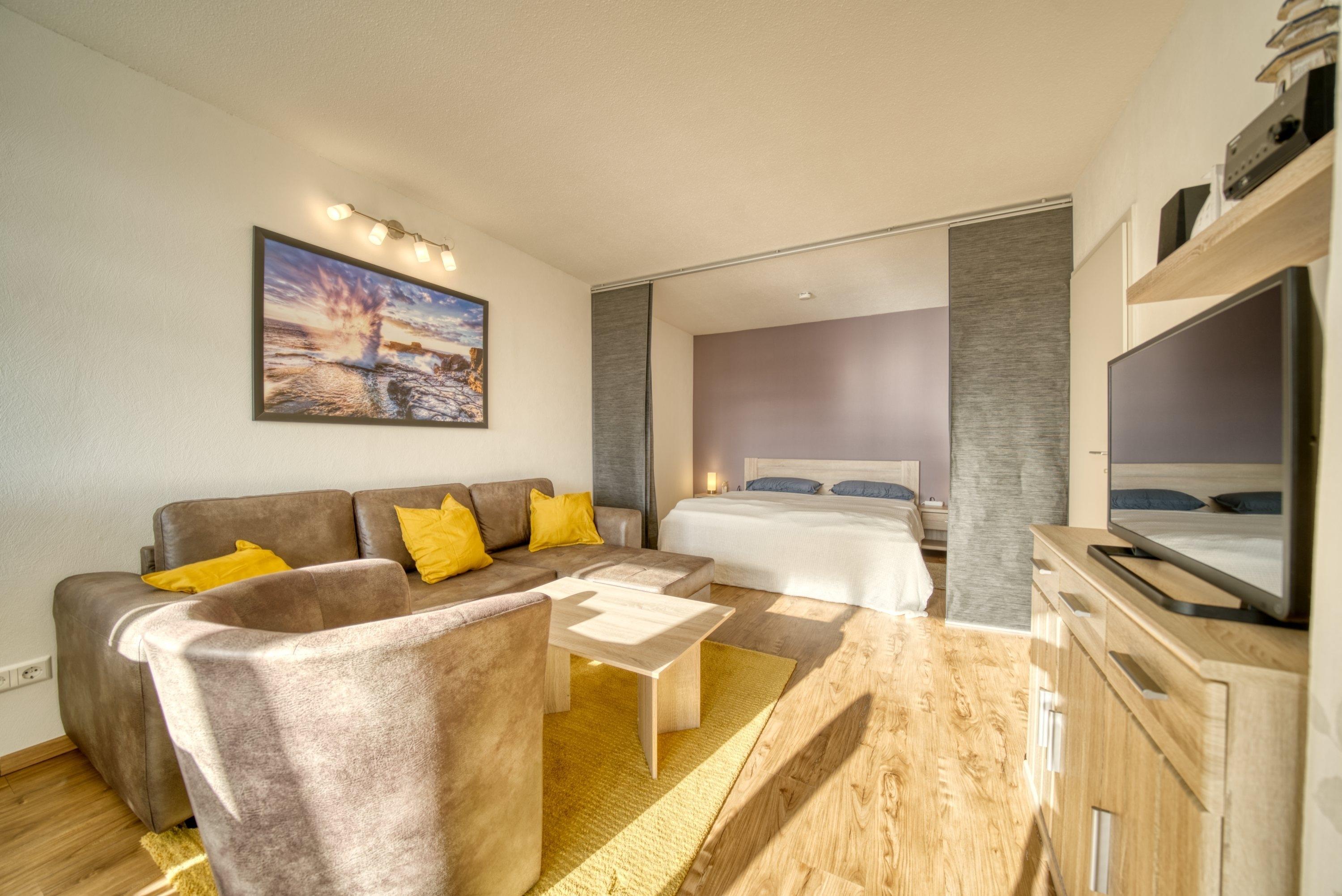 Wohn-Schlafbereich mit Doppelbett [&] SchlafsofaSeparates Schlafzimmer mit EtagenbettLaminatboden