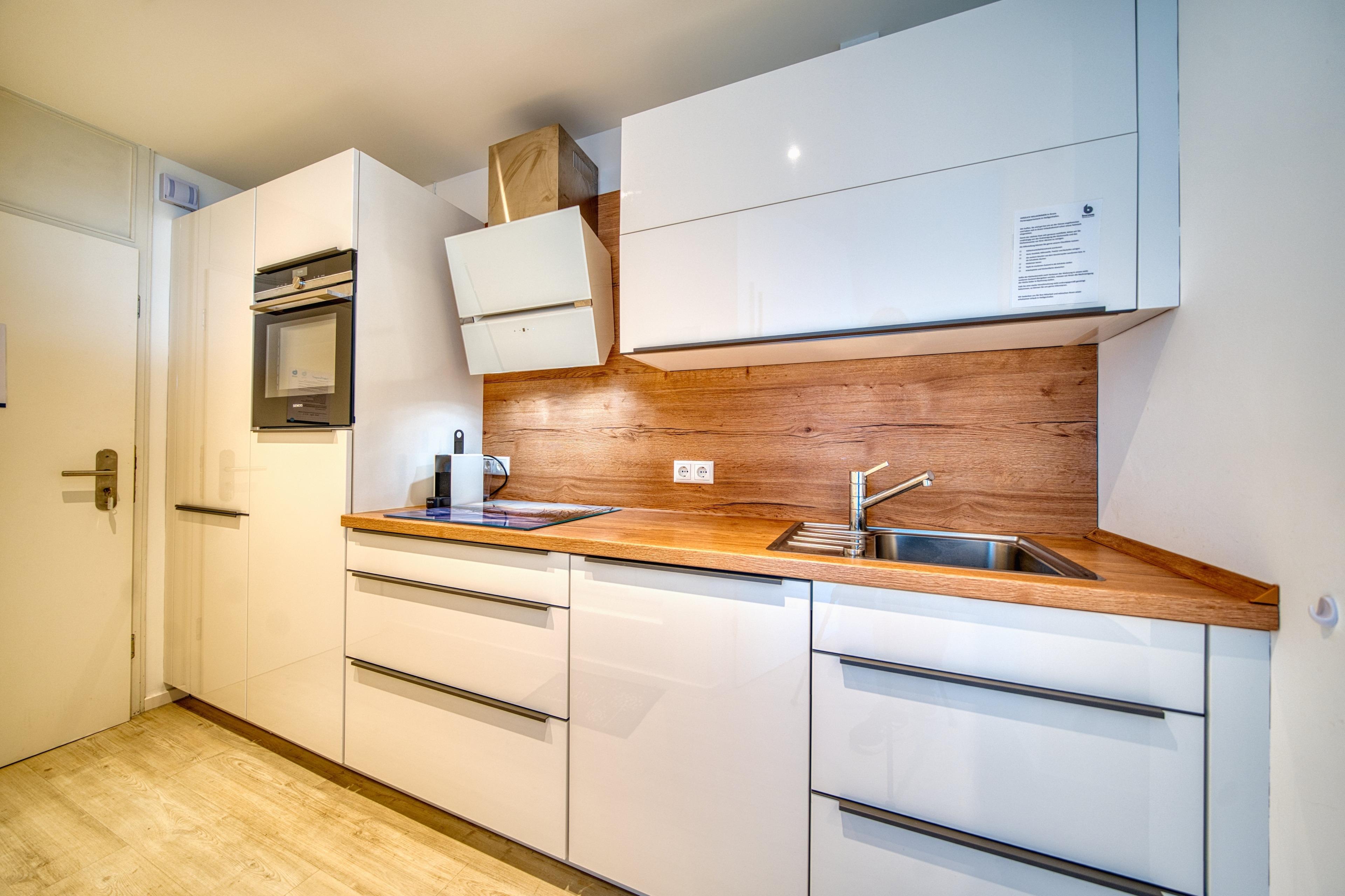 Vollständig ausgestattete Einbauküche mit ausreichend Stauraum und Geschirr