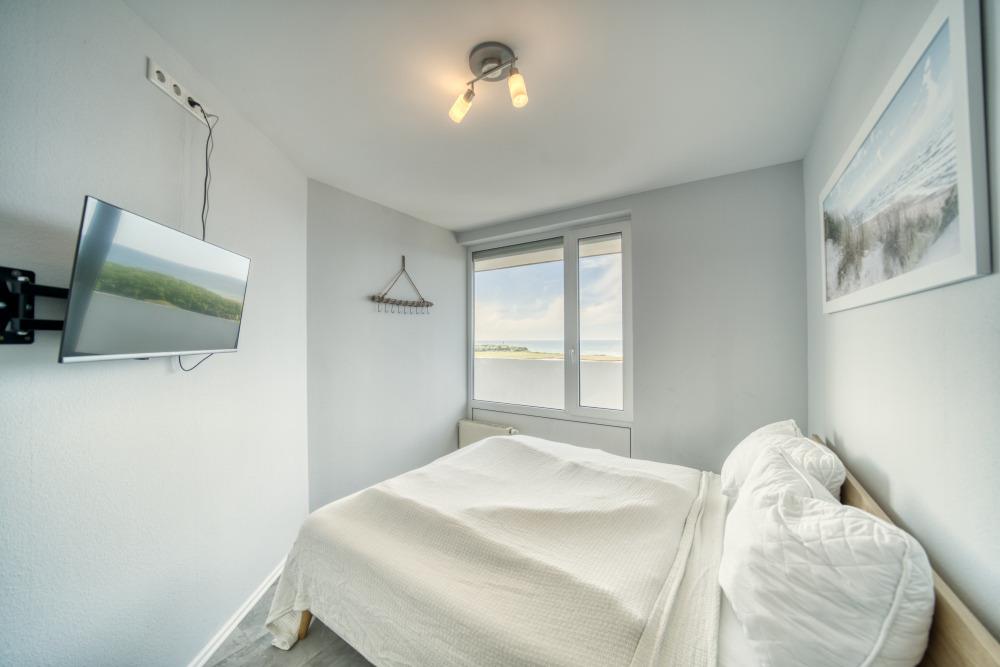 Schlafzimmer mit Doppelbett und Ostseeblick