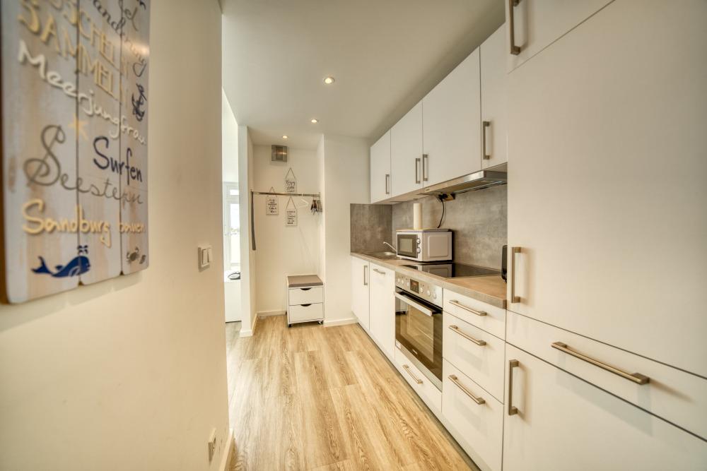 Küche im Eingangsbereich, hochwertig ausgestattet mit 4-Platten-Ceranfeld, Backofen, Geschirrspüler, Kühlschrank mit Gefrierfach, Kaffeemaschine, Wasserkocher und Geschirr