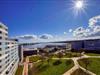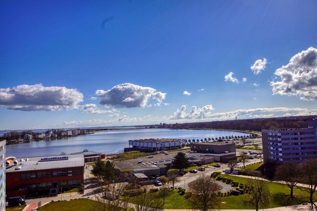 Die Ferienwohnung im Haus E, 9. Etage, mit Balkon, bietet einen herrlichen Panoramablick auf den Binnensee, den Yachthafen und die Küstenstadt Heiligenhafen.