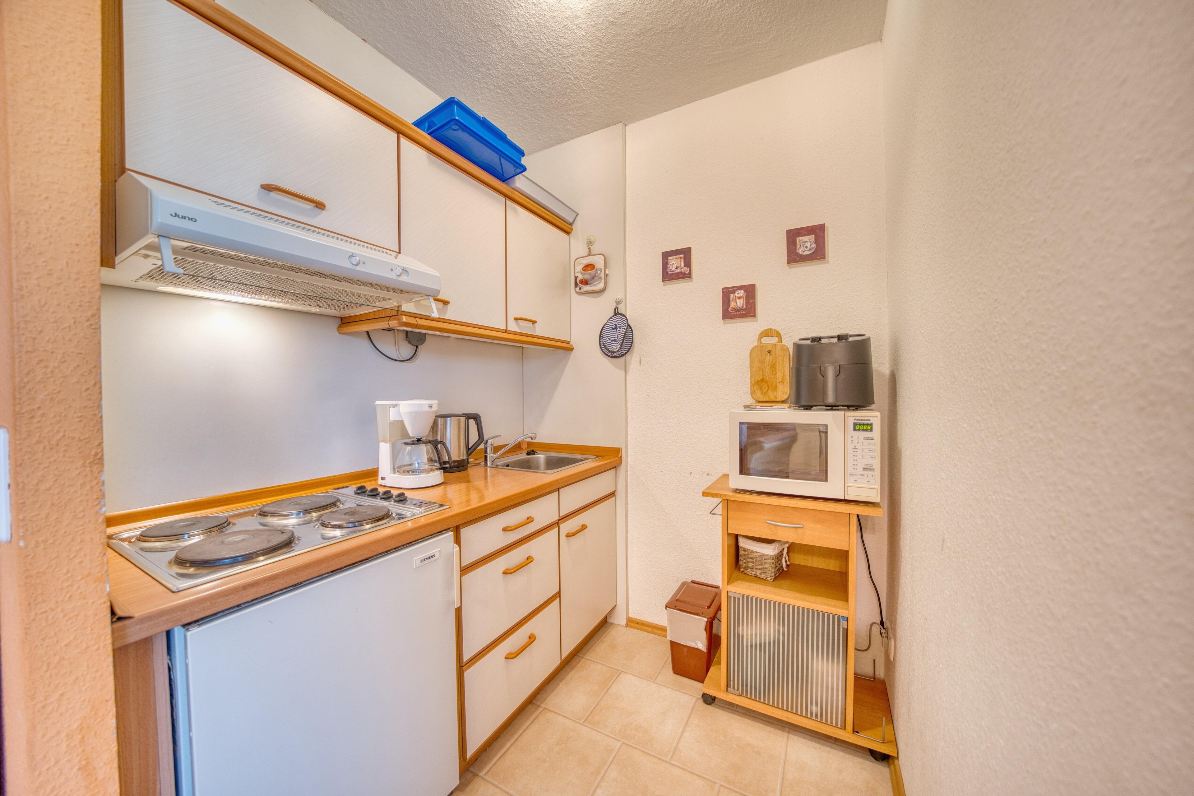 Küche mit 4-Plattenherd, Filterkaffeemaschine, Mikrowelle, Toaster, Wasserkocher und Heißluftfritteuse