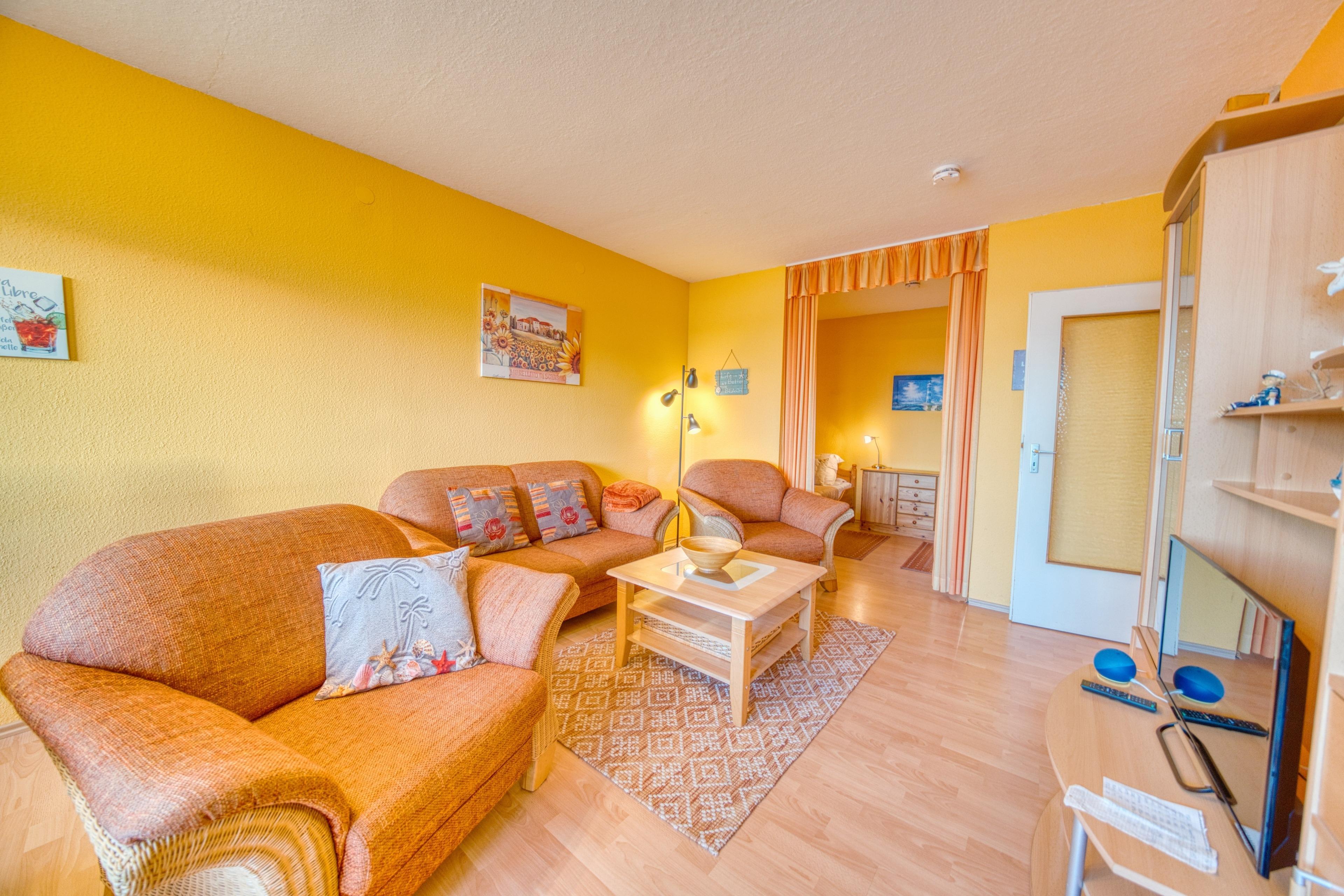 Wohnbereich mit Sofa, Sesseln und Flachbild-TV für entspannte Abende