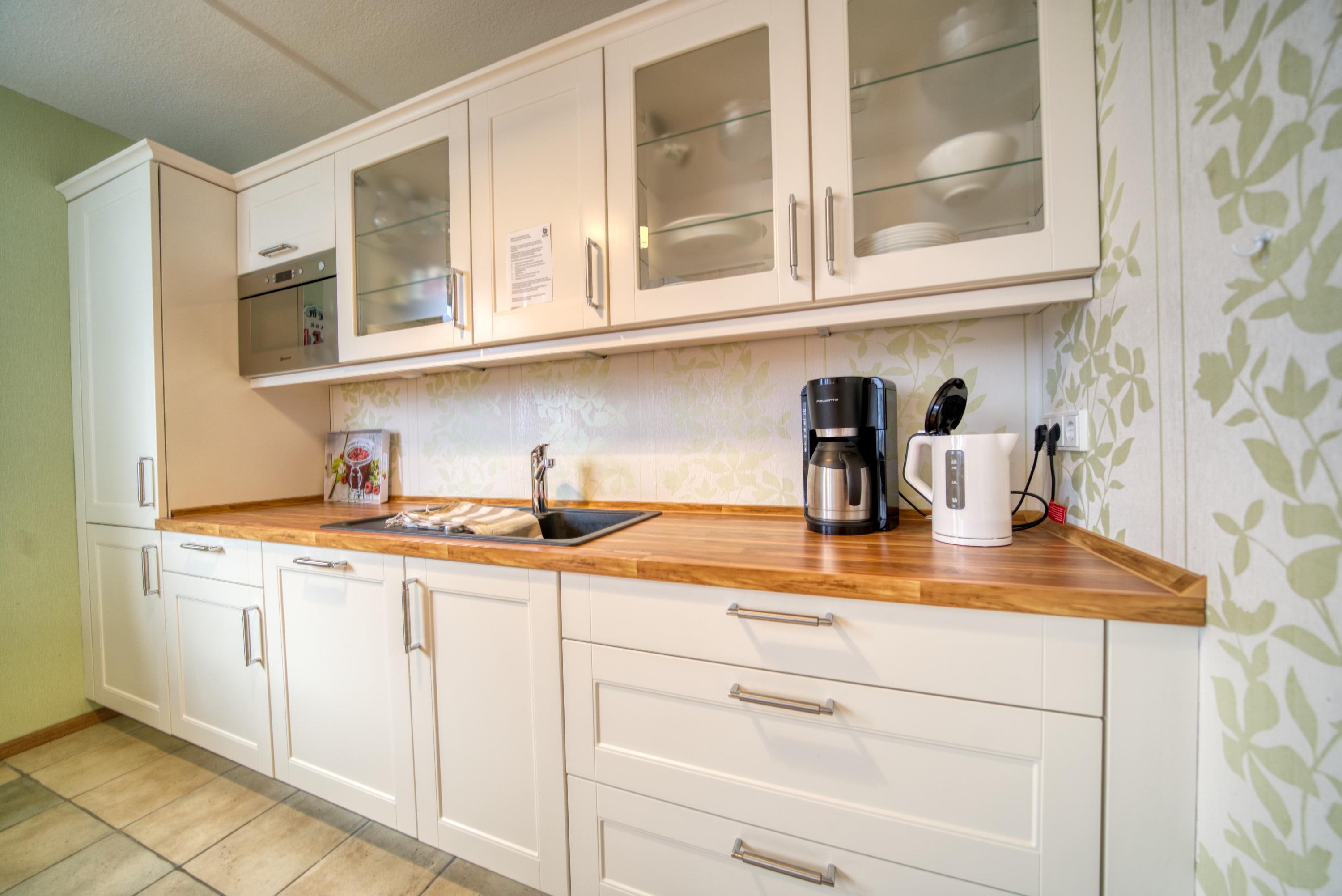 Komplett modernisierte Küche mit Kaffeemaschine, Wasserkocher, Toaster, Kühlschrank mit Gefrierfach, 4-Platten-Herd und Backofen
