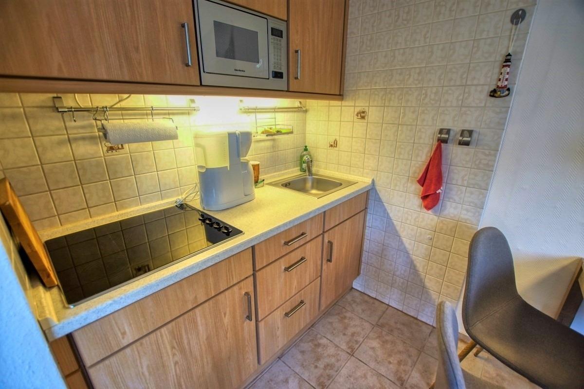 Küche mit Herd, Mikrowelle und Kaffeemaschine