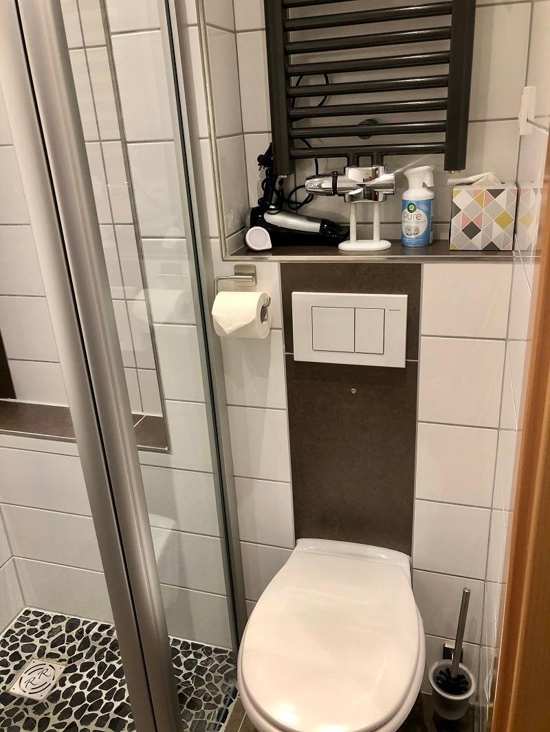 Bad mit Duschkabine, extra Lüftung und ebenerdigem Dusch-Einstieg und ein Flur mit viel Staufläche.