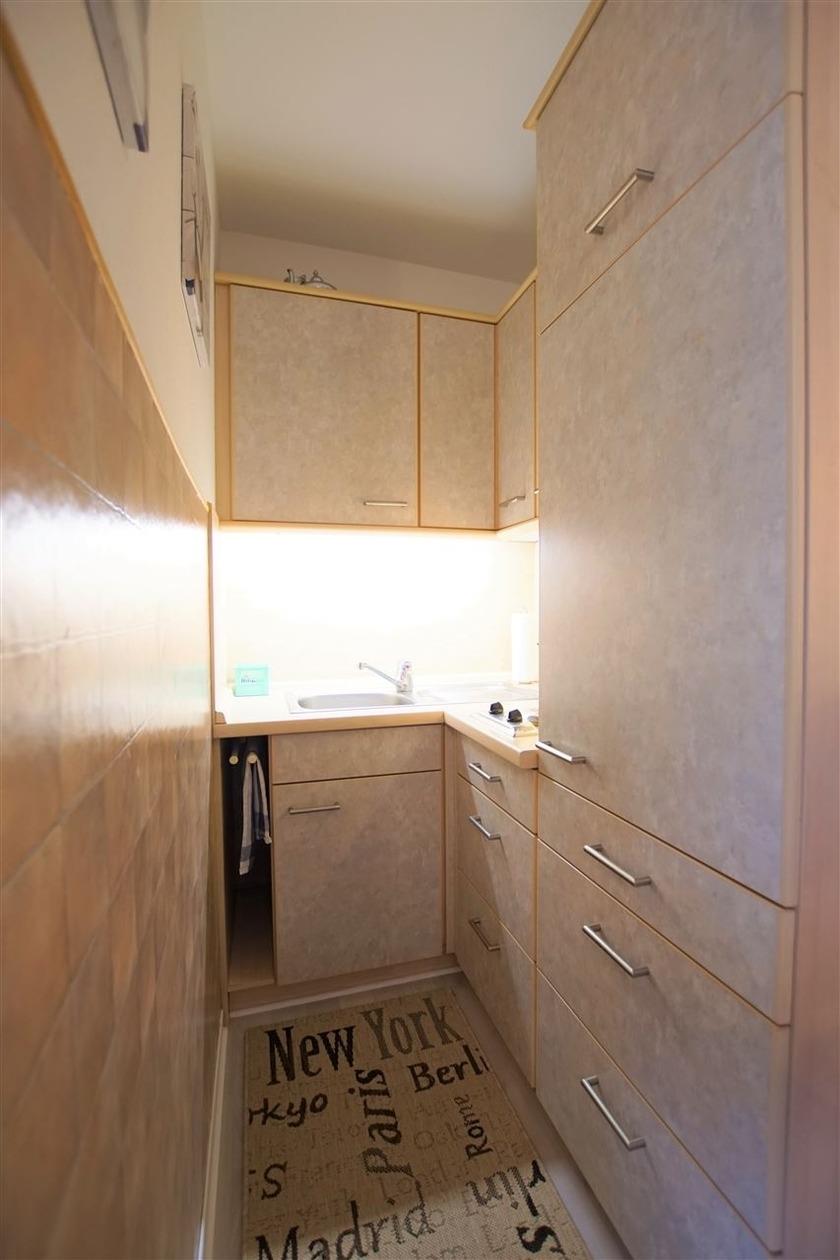 Küche mit 2-Plattenherd, Kühlschrank inkl. Gefrierfach, Mikrowelle, Mini-Backofen, Kaffeemaschine, Toaster und Wasserkocher