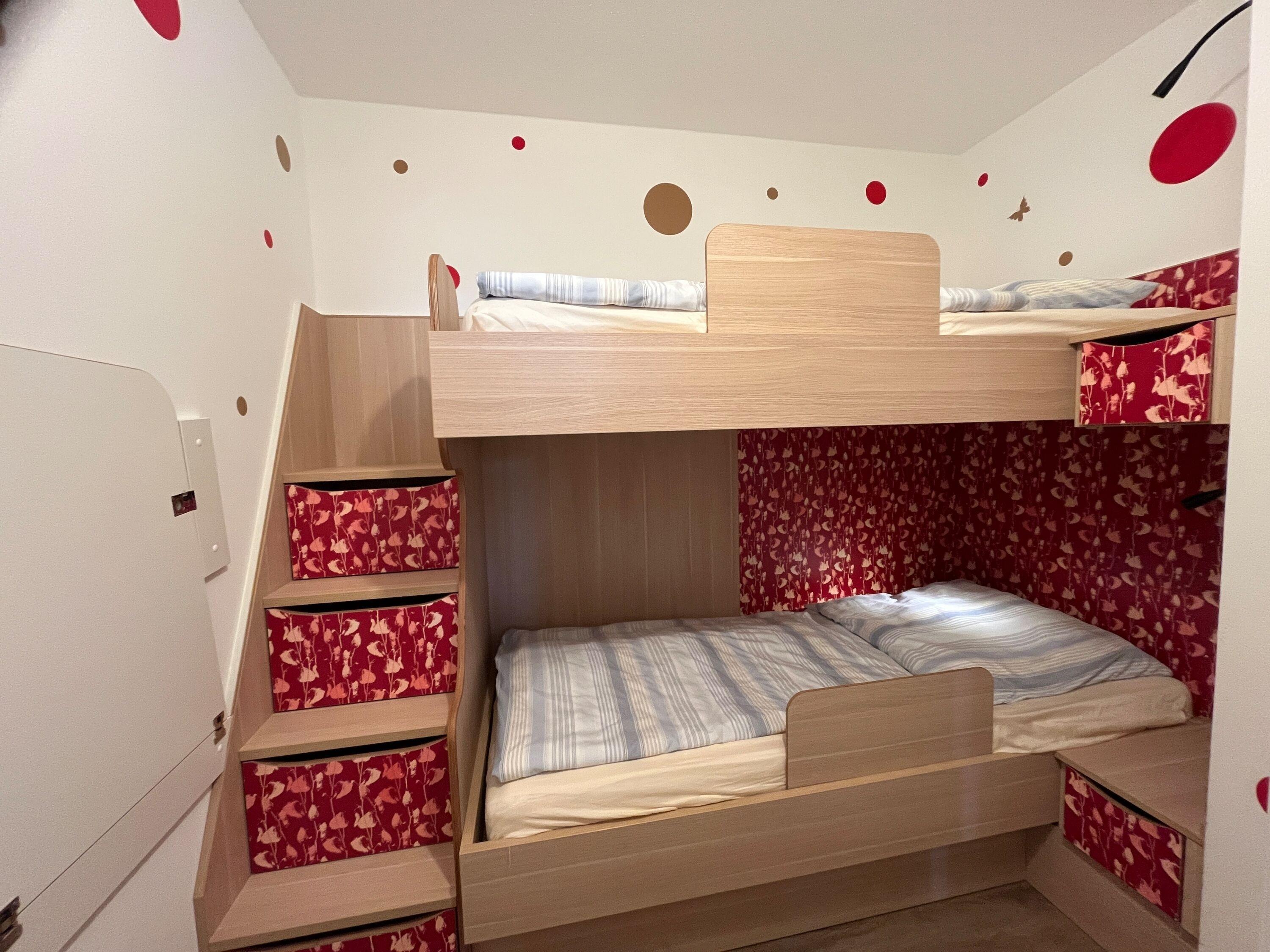 Kinderzimmer mit Etagenbett, Fenster zum Wohnbereich [&] ausklappbarem Arbeitsplatz