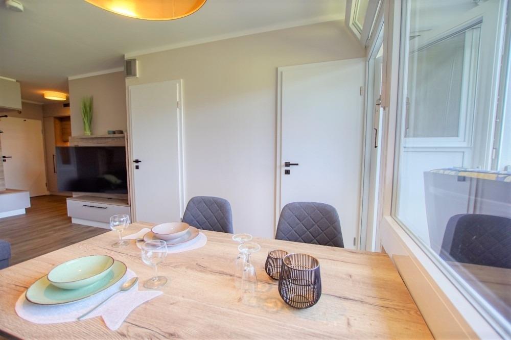Essplatz am Fenster mit Zugang zum möblierten Balkon