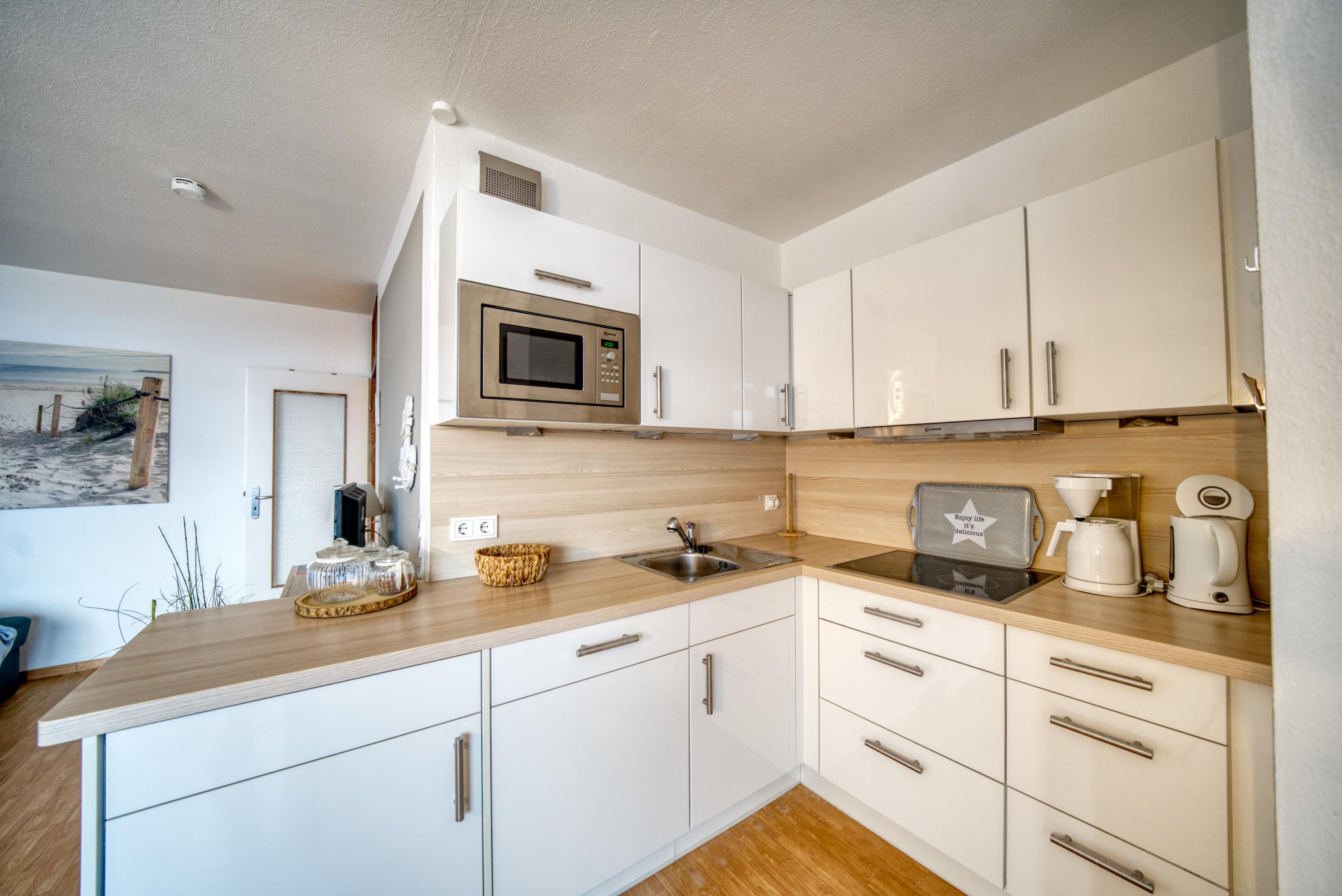 Küche: Die Küche ist bestens ausgestattet und lässt keine Wünsche offen. Mit Mikrowelle, Heißluftfritteuse, Kühlschrank, 4-Plattenherd und Geschirrspüler können Sie sich im Urlaub wie zu Hause fühlen. Bereiten Sie sich Ihre Lieblingsgerichte zu oder genießen Sie lokale Spezialitäten.