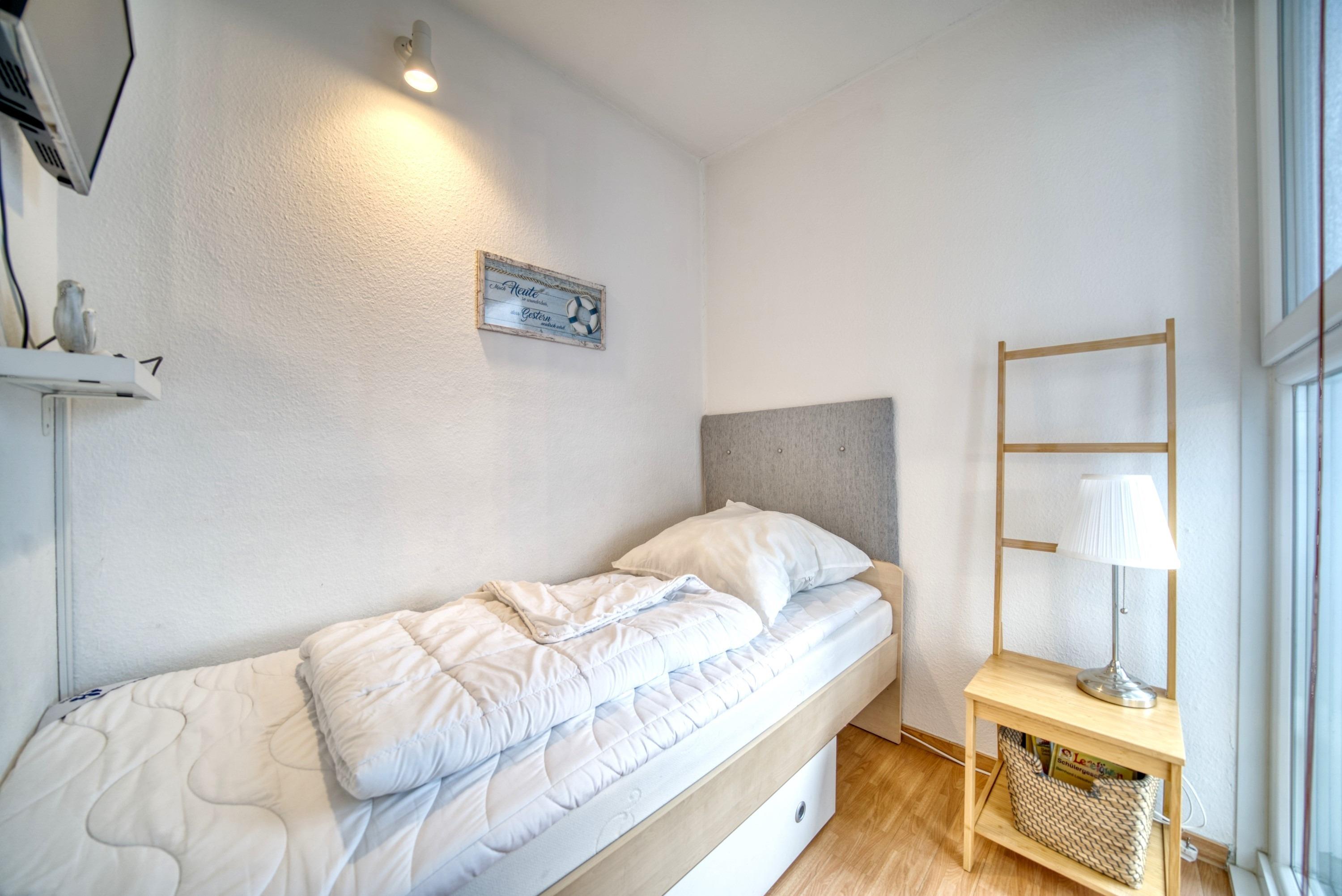 Schlafzimmer: Das separate Schlafzimmer verfügt über ein Einzelbett und einen eigenen TV, ideal für ruhige Nächte und erholsame Schlafzeiten.