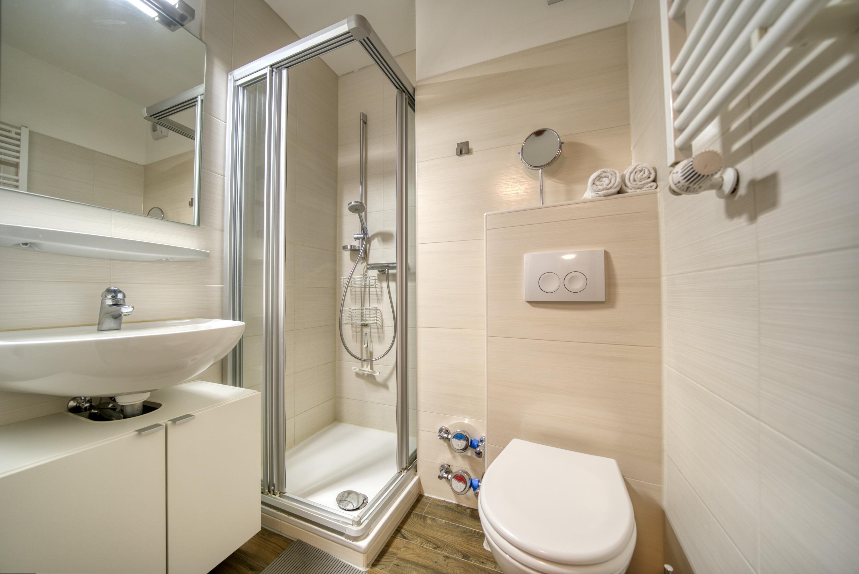 Modernes Bad und praktische ZusatzleistungenDas Badezimmer ist mit einer Duschkabine und WC ausgestattet.