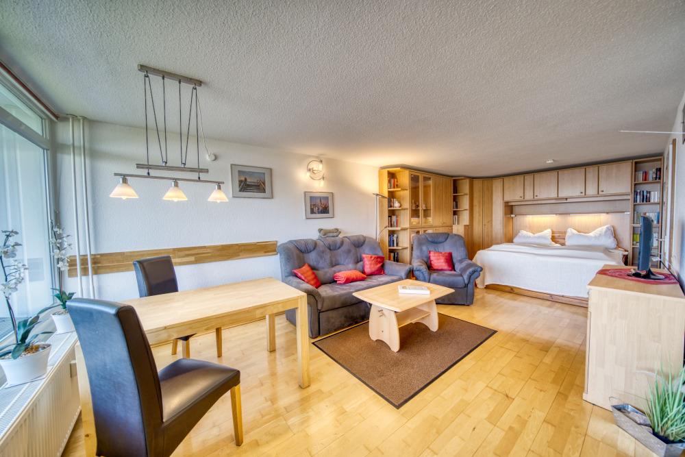 Heller Wohn-Schlafbereich mit gemütlichem Doppelbett