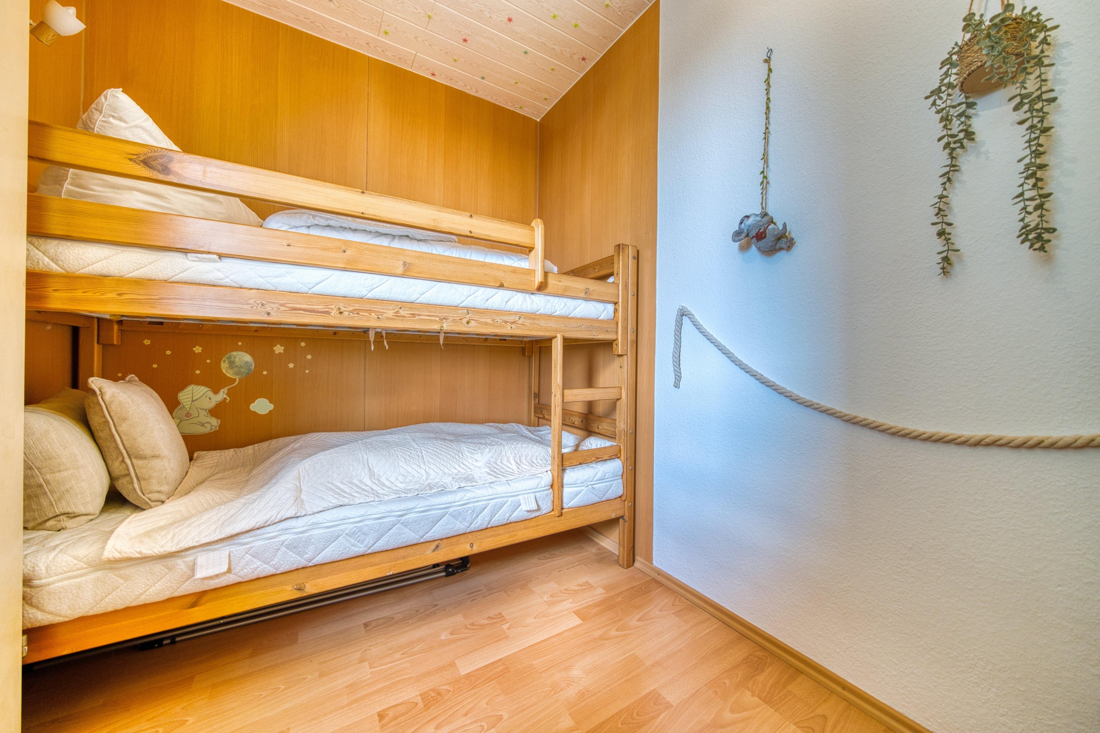 Schlafbereich für bis zu 4 Personen – Der Schlafbereich ist mit Einzelbetten ausgestattet, die für maximalen Komfort sorgen und bei Bedarf zu einem Doppelbett zusammengeschoben werden können. Im Kinderzimmer finden die Kleinen ein praktisches Etagenbett.
