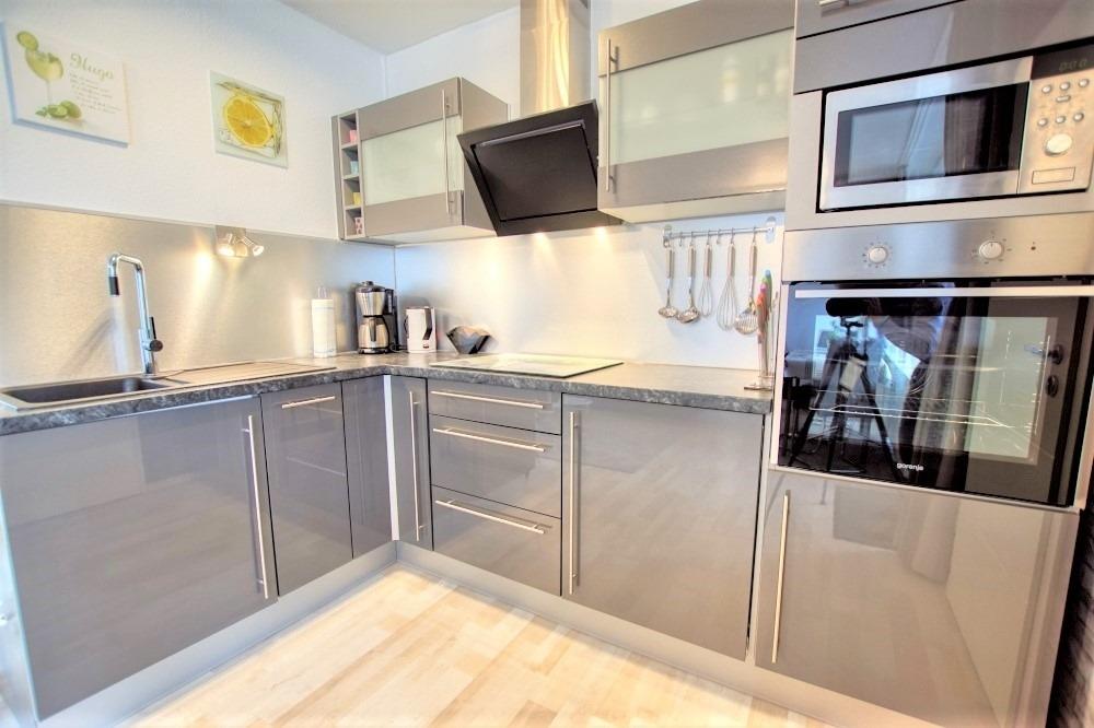 Küche mit Backofen, 4-Platten-Ceranfeld, Kühlschrank mit Gefrierfach, Mikrowelle, Kaffeemaschine, Wasserkocher und Toaster