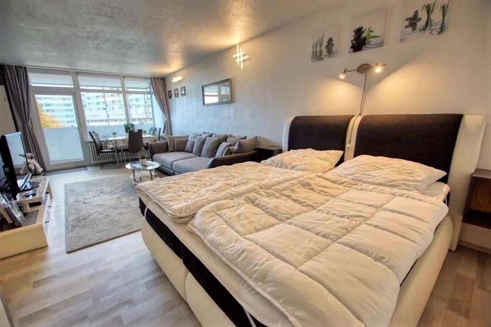 Offener Wohn-Schlafbereich mit Doppelbett und Fernseher