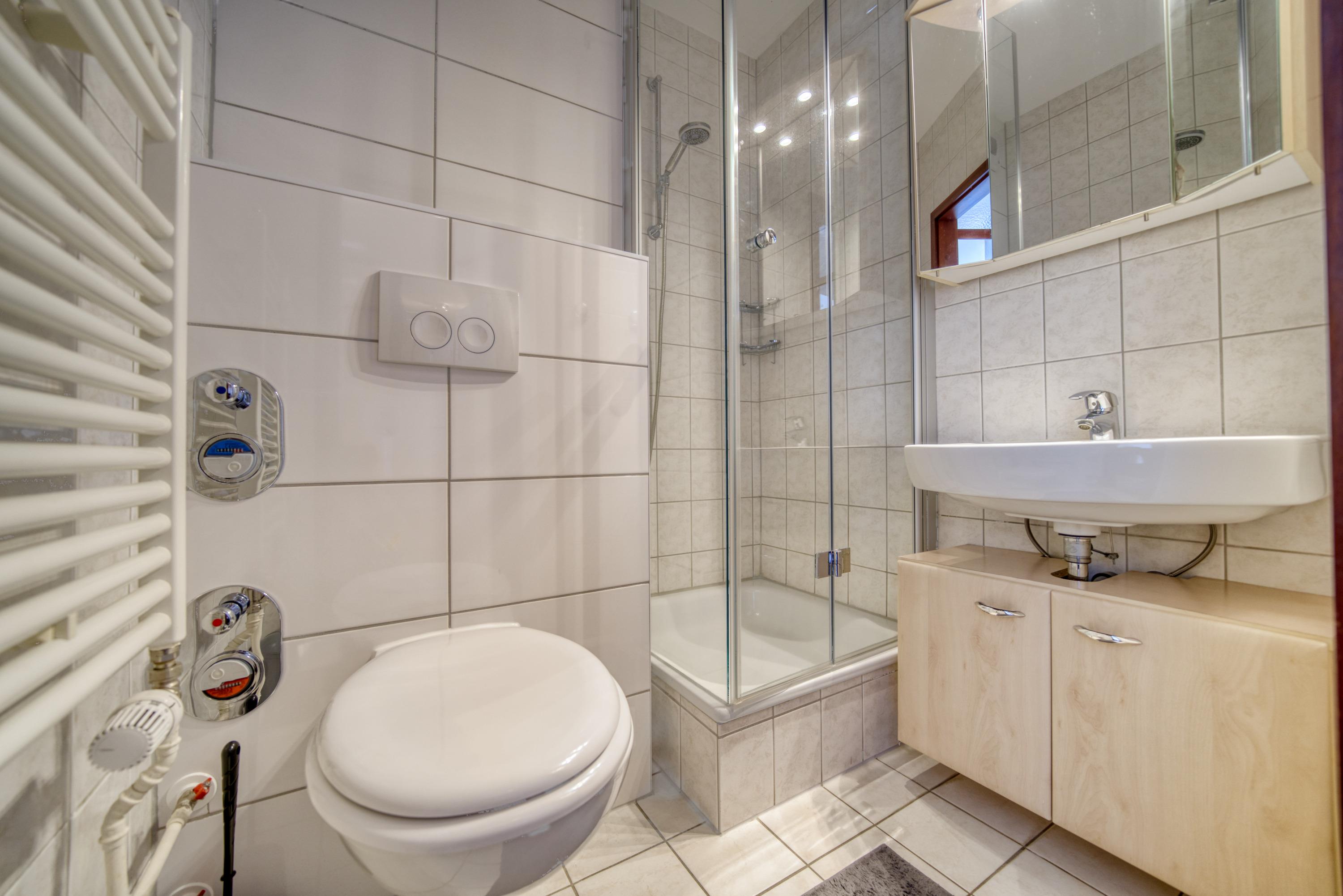 Badezimmer mit WC und Duschkabine und Handtuchtrockner