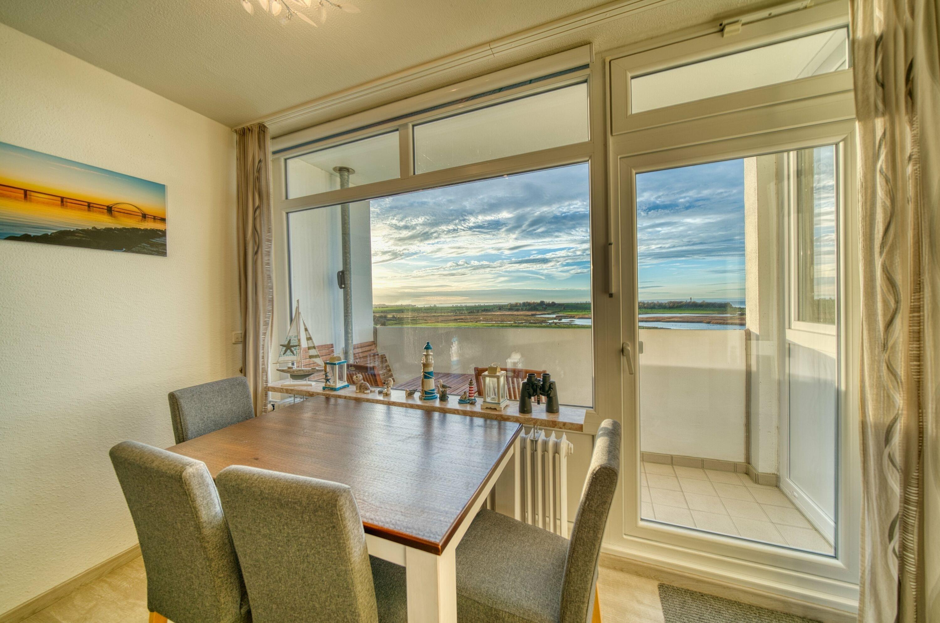 Esstisch vor dem Balkon, um Mahlzeiten mit Blick auf die Ostsee zu genießen