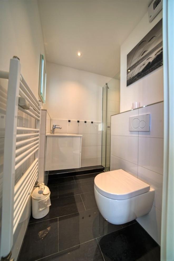 Modernes Bad mit Duschkabine mit niedrigem Einstieg, WC und Handtuchtrockner