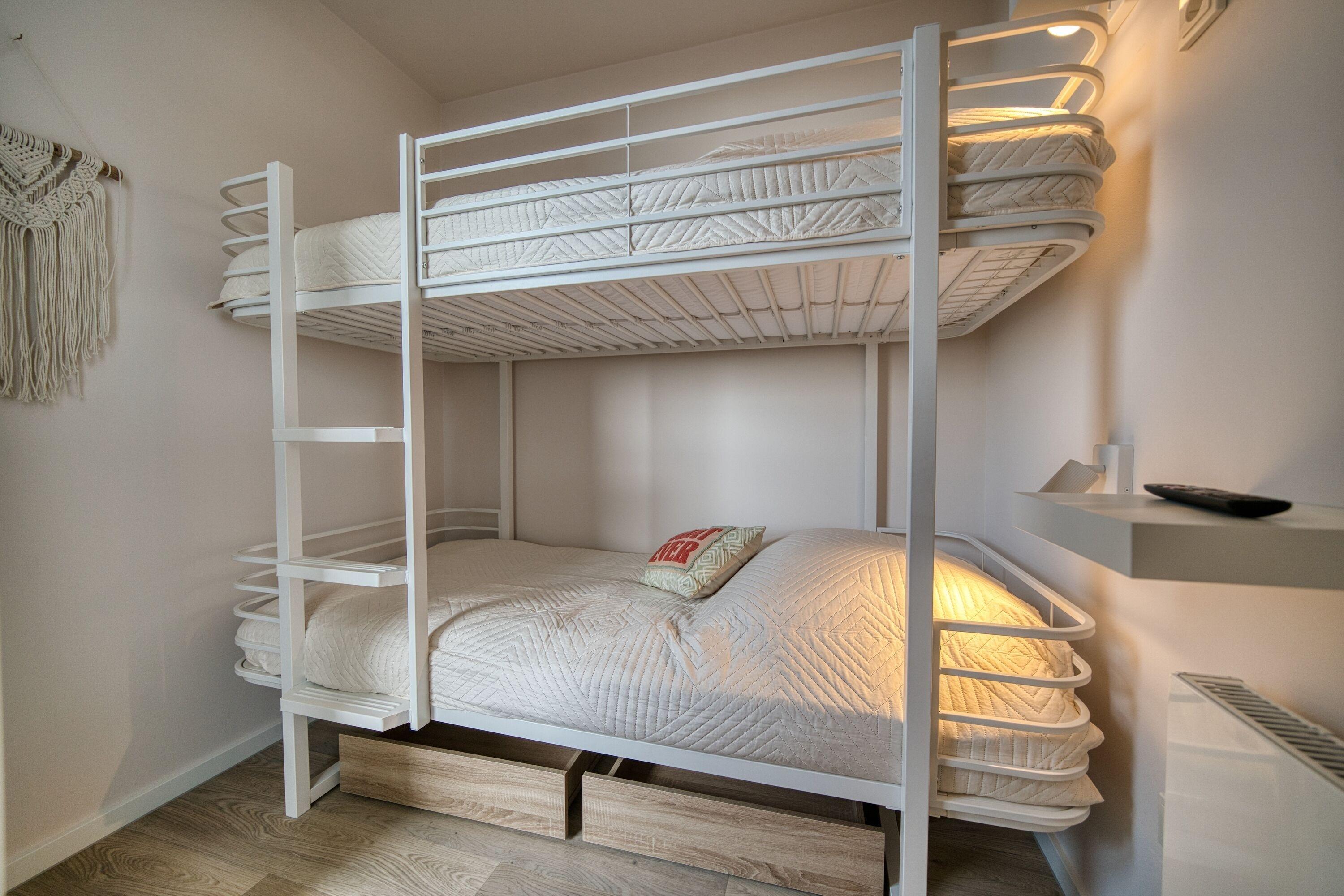 Kinderzimmer: Das Kinderzimmer bietet ein praktisches Etagenbett mit darunterliegenden Bettschubladen zum Verstauen von Kleidungsstücken – perfekt für die Kleinen.