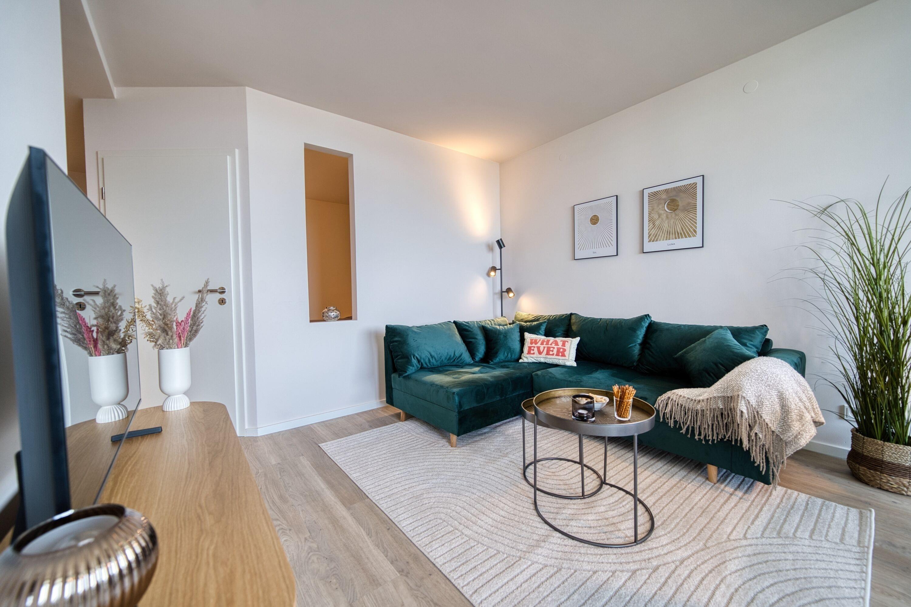 Wohnbereich: Der ansprechende Wohnbereich ist mit einem komfortablen Sofa und einem Smart-TV ausgestattet. Hier können Sie nach einem aktiven Tag an der Ostsee entspannen.