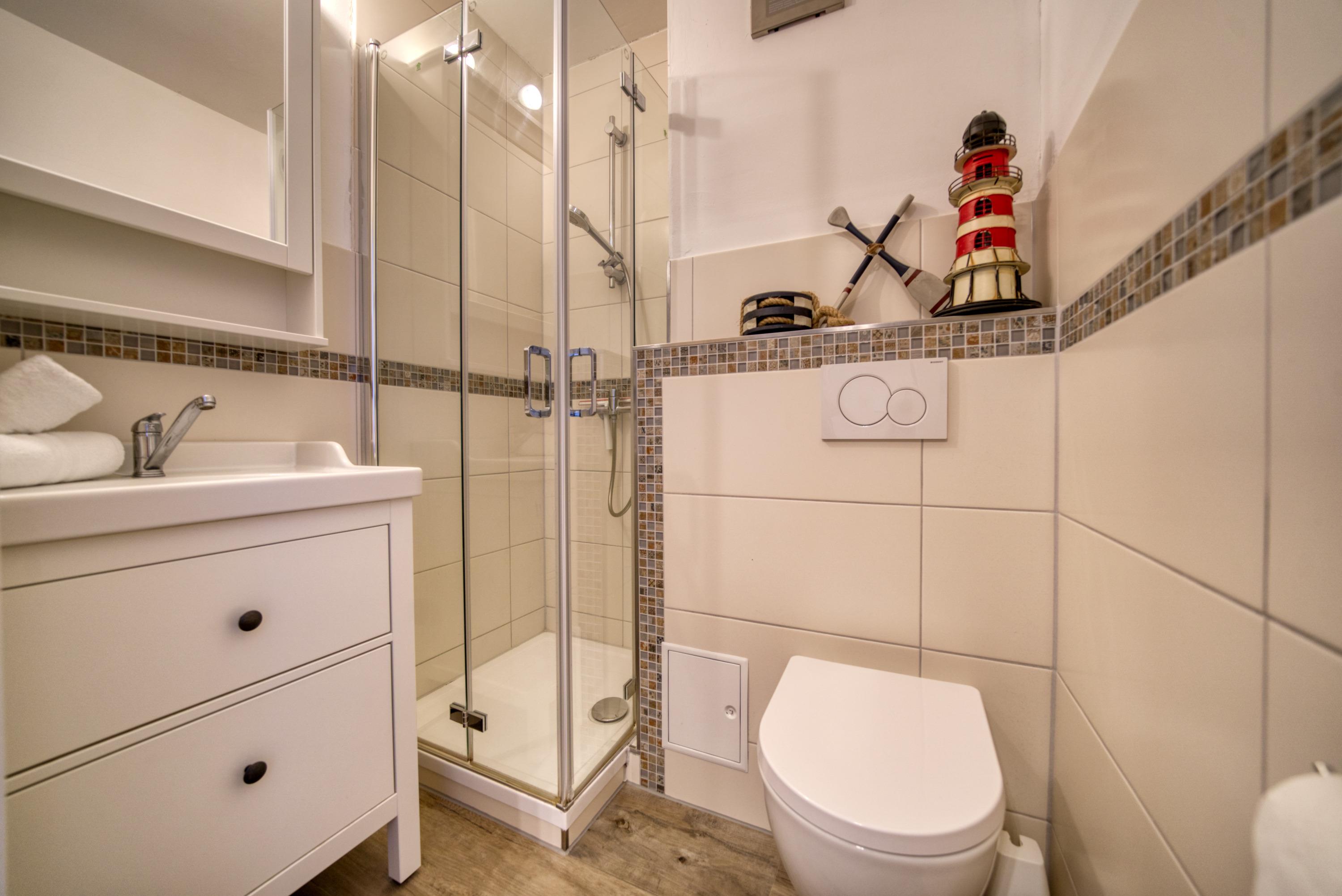 Funktionales Badezimmer mit Duschkabine mit niedrigem Einstieg