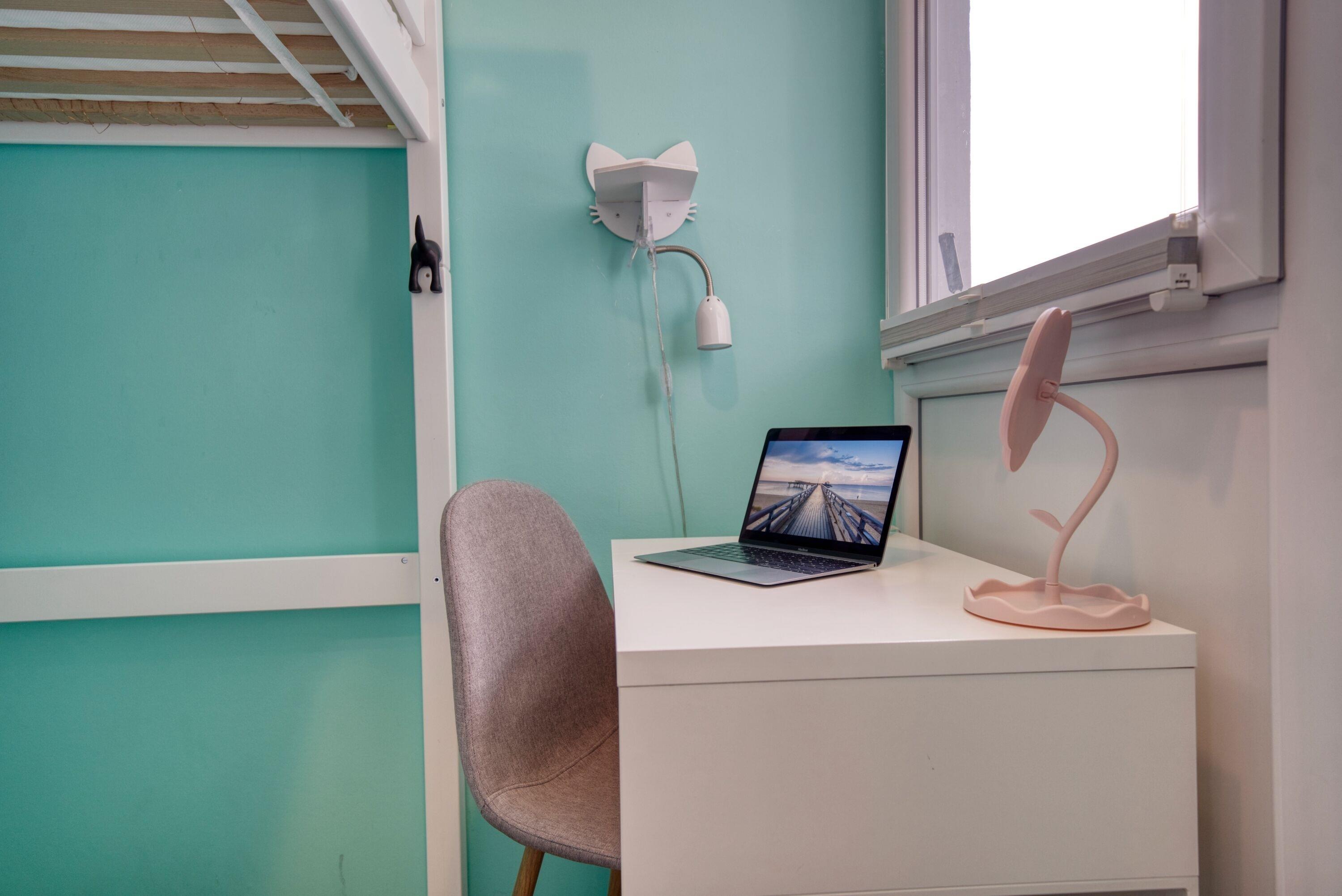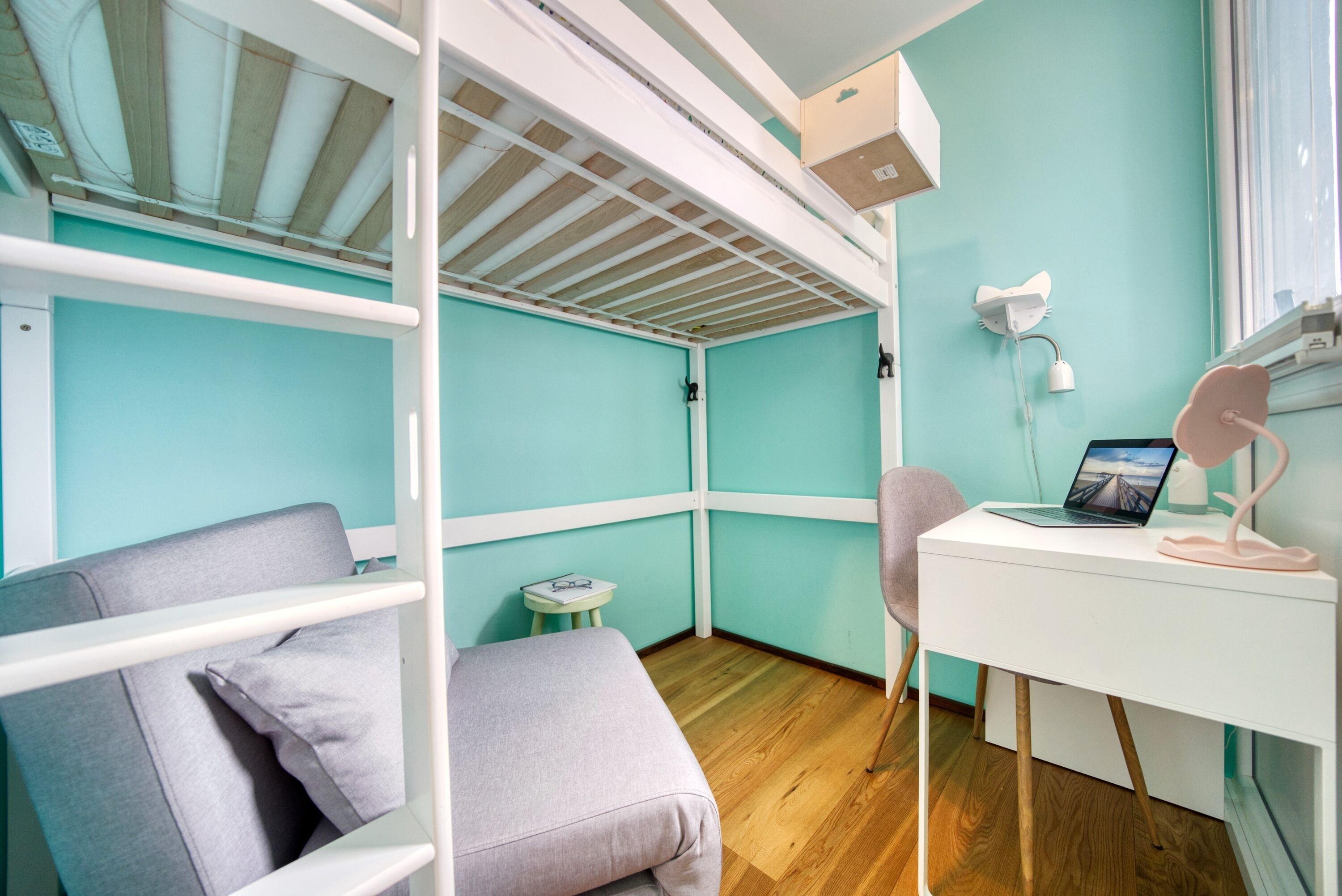 Separates Kinder-/ Arbeitszimmer: Das Kinderzimmer ist mit einem einzelnen Etagenbett, einem ausklappbaren Schlafsessel und einem Schreibtisch ausgestattet.