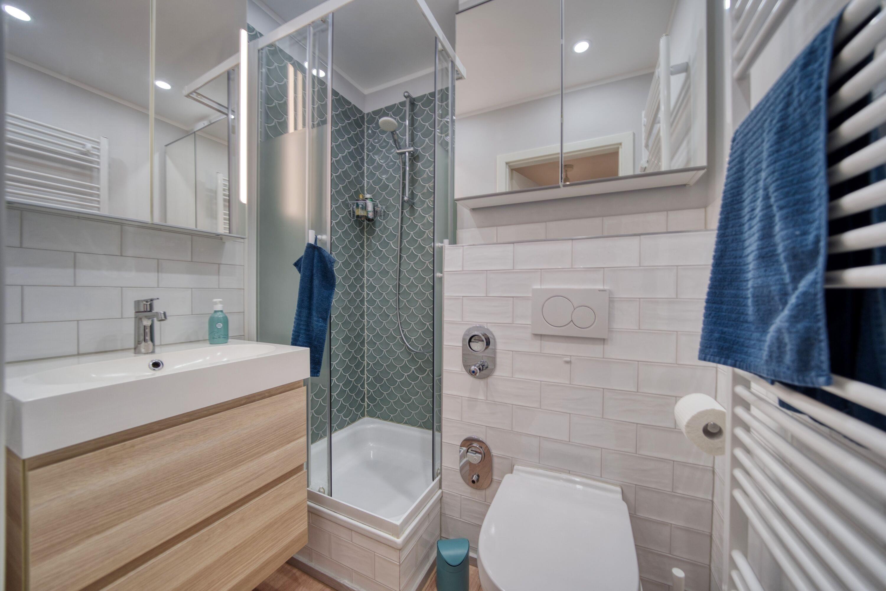 Badezimmer: Das moderne Badezimmer ist mit einer Dusche ausgestattet und bietet Platz, um sich nach einem Tag am Strand zu erfrischen.