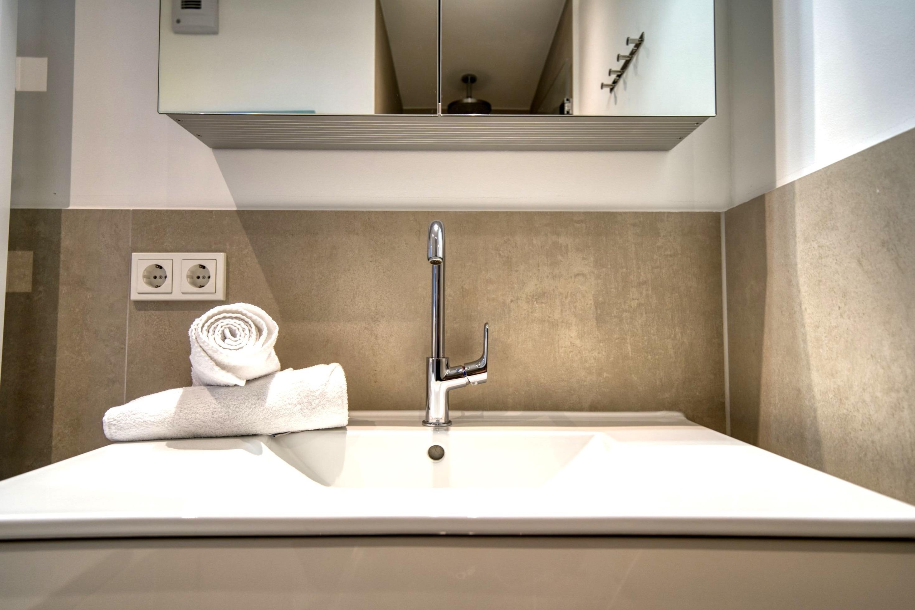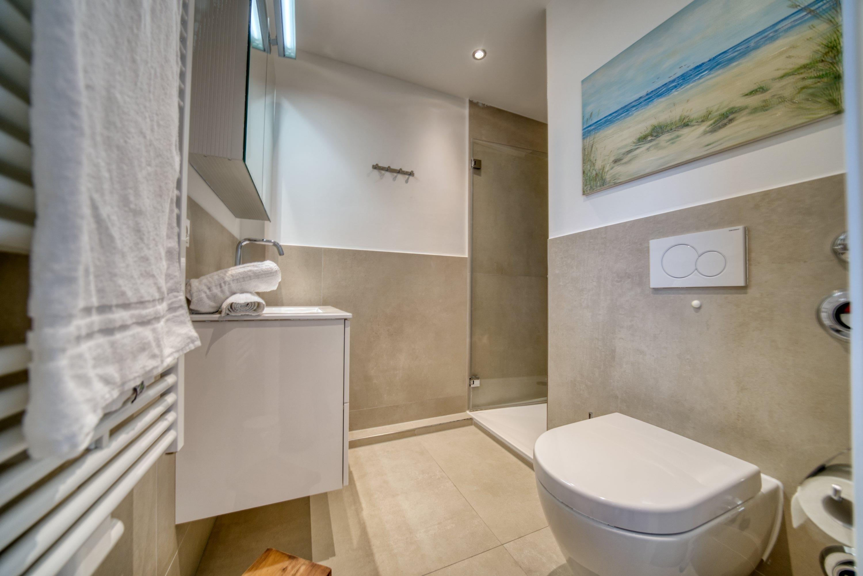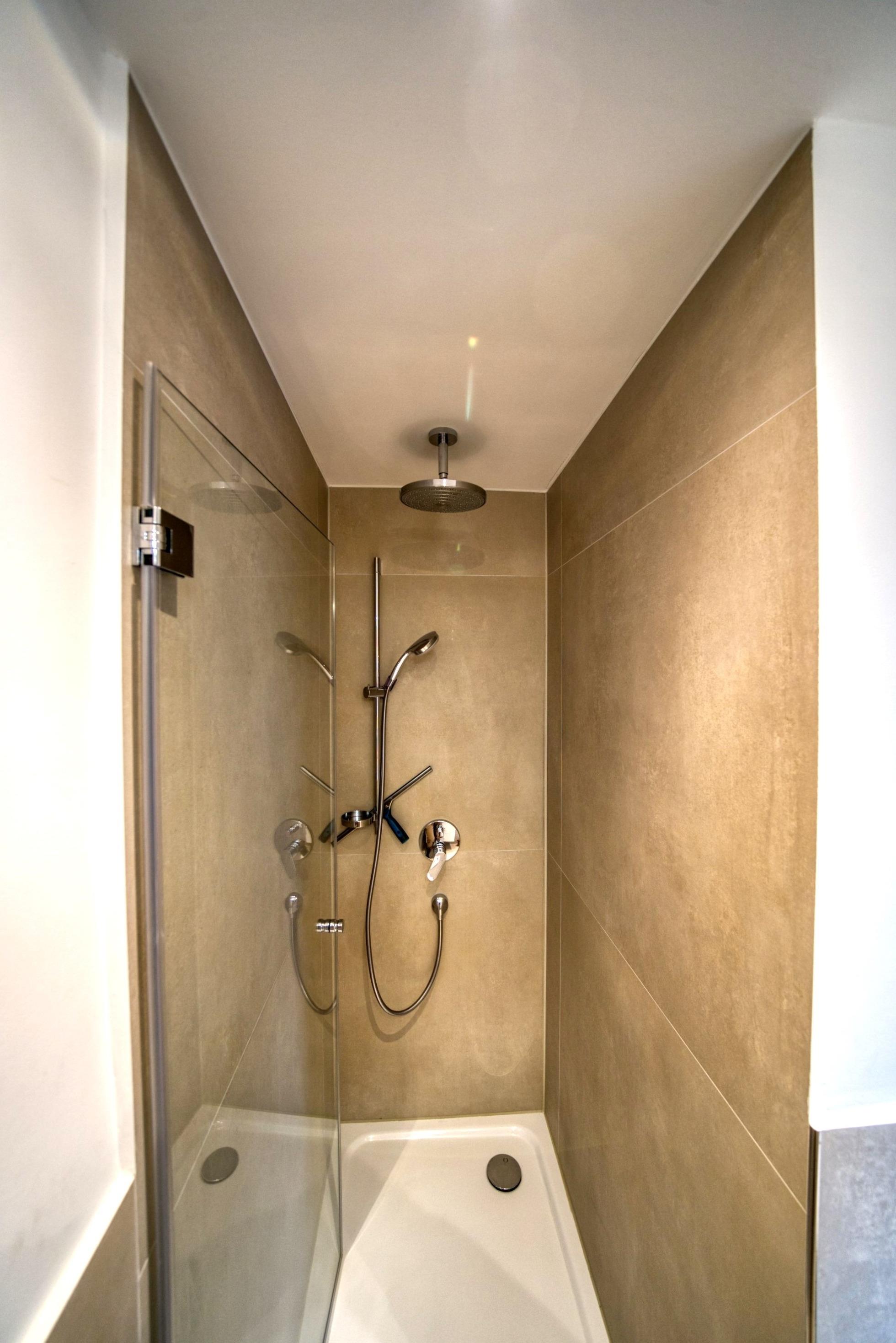Modernes, neuwertiges Bad mit großzügiger Dusche und stilvoller Ausstattung