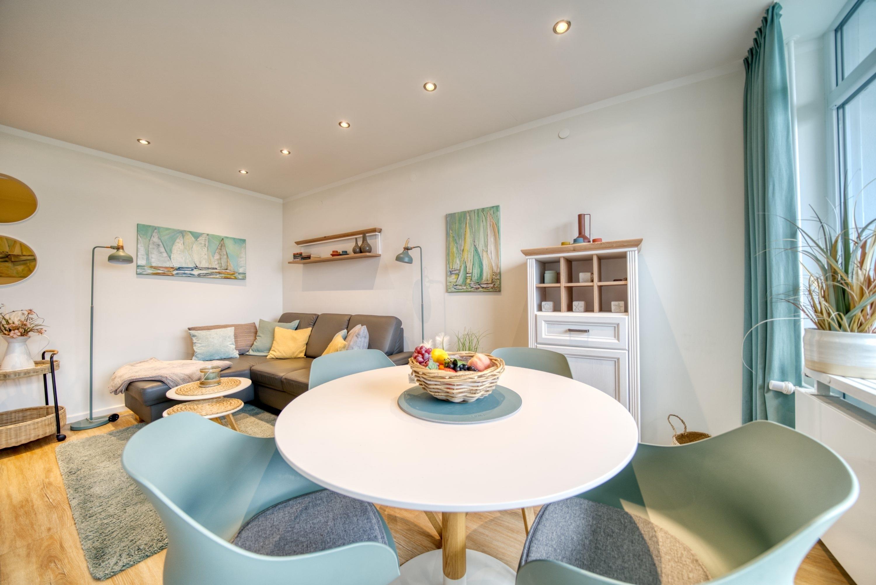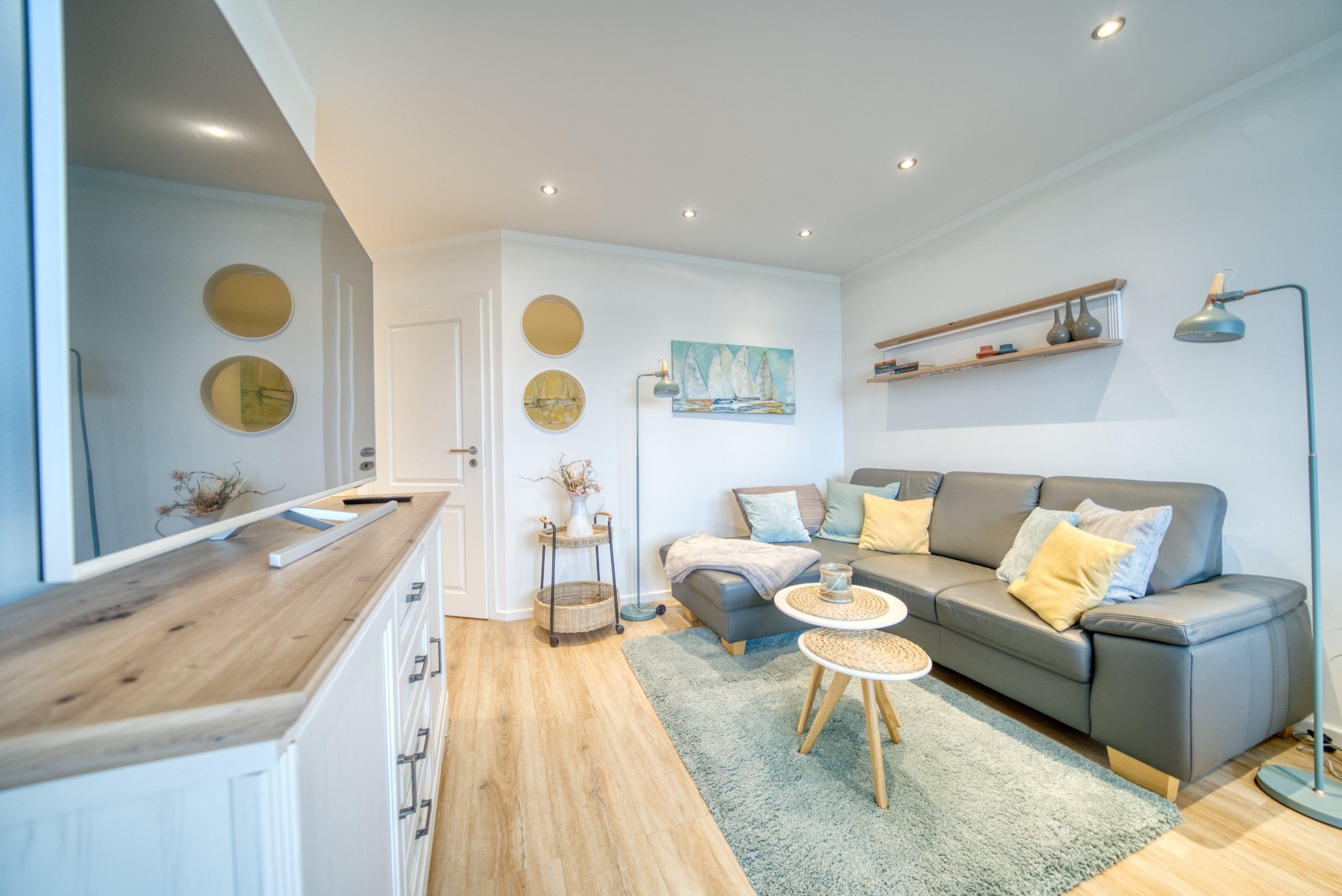 Offener Wohnbereich mit gemütlichem Ecksofa, großem Flachbild-TV und Essbereich für 4 Personen