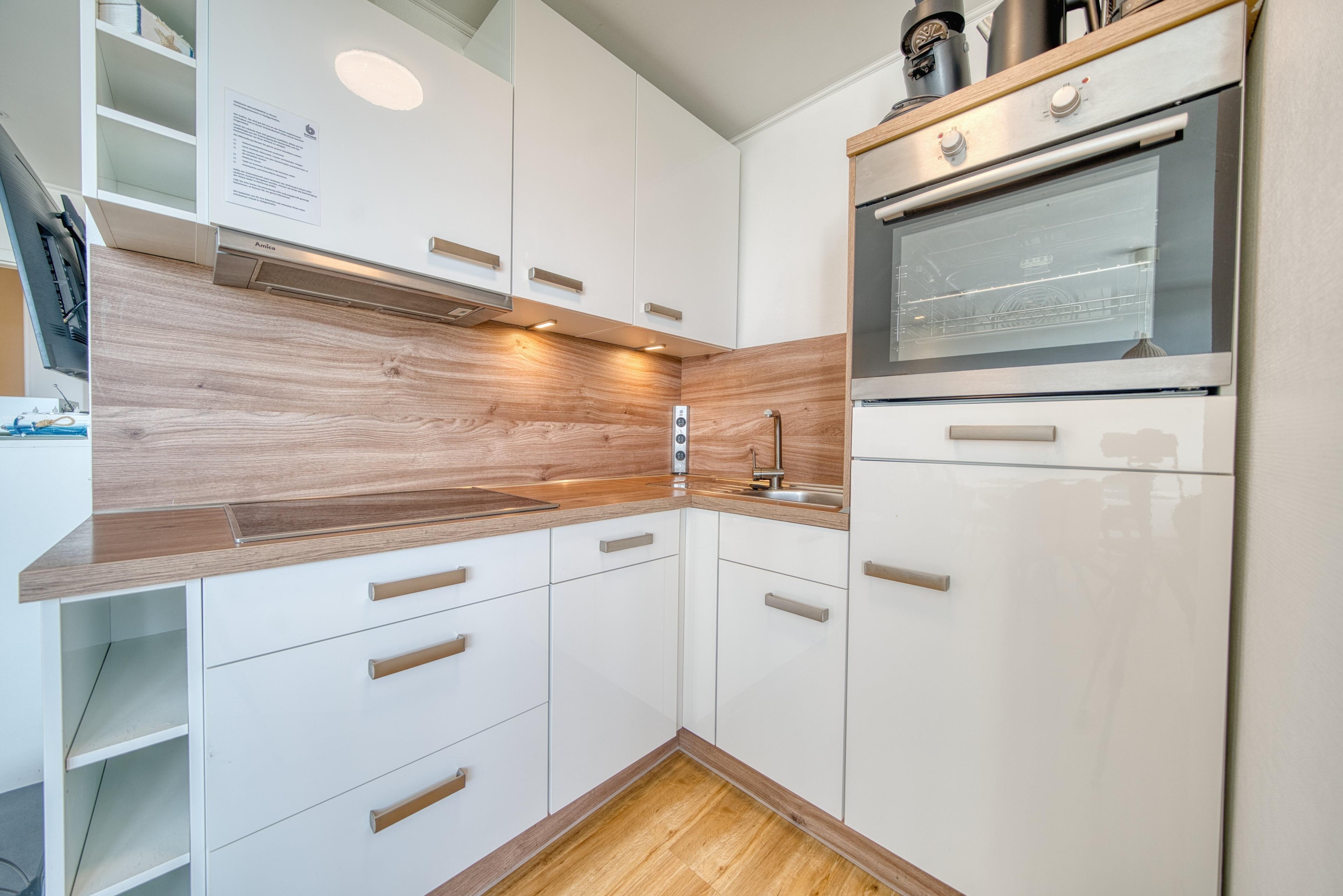 Voll ausgestattete Küche mit Geschirrspüler, Backofen, Ceranherd, Kühlschrank mit Gefrierfach