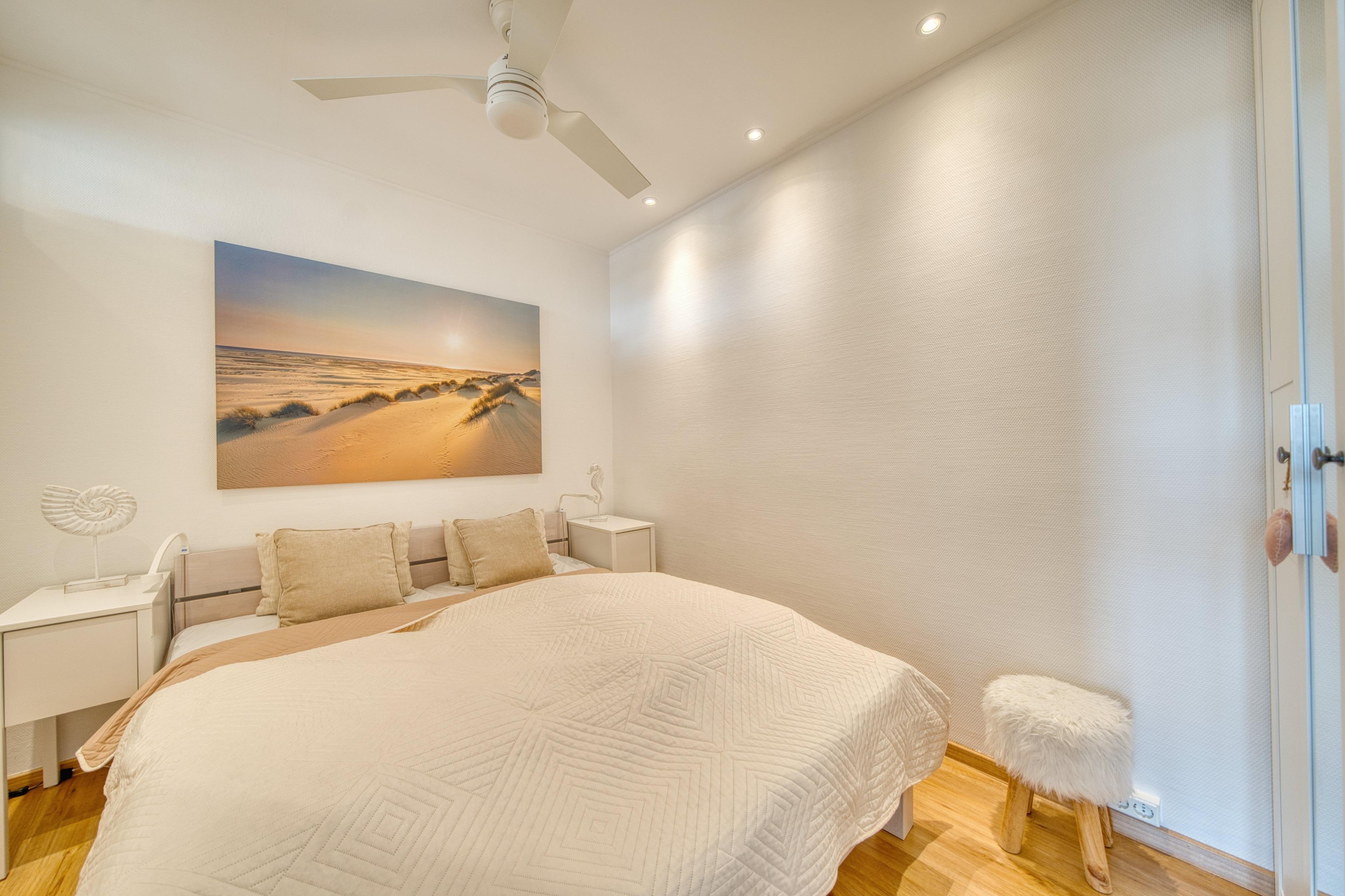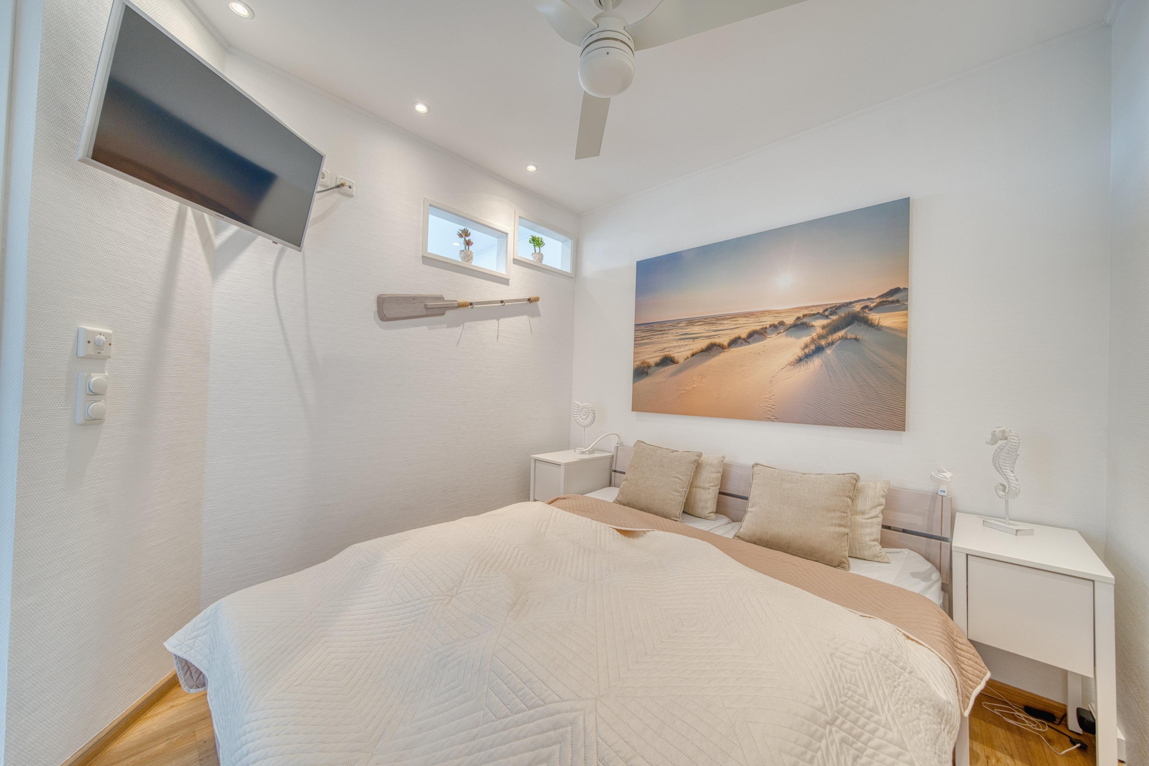 Separates Schlafzimmer mit komfortablem Doppelbett, Deckenventilator und eigenem TV