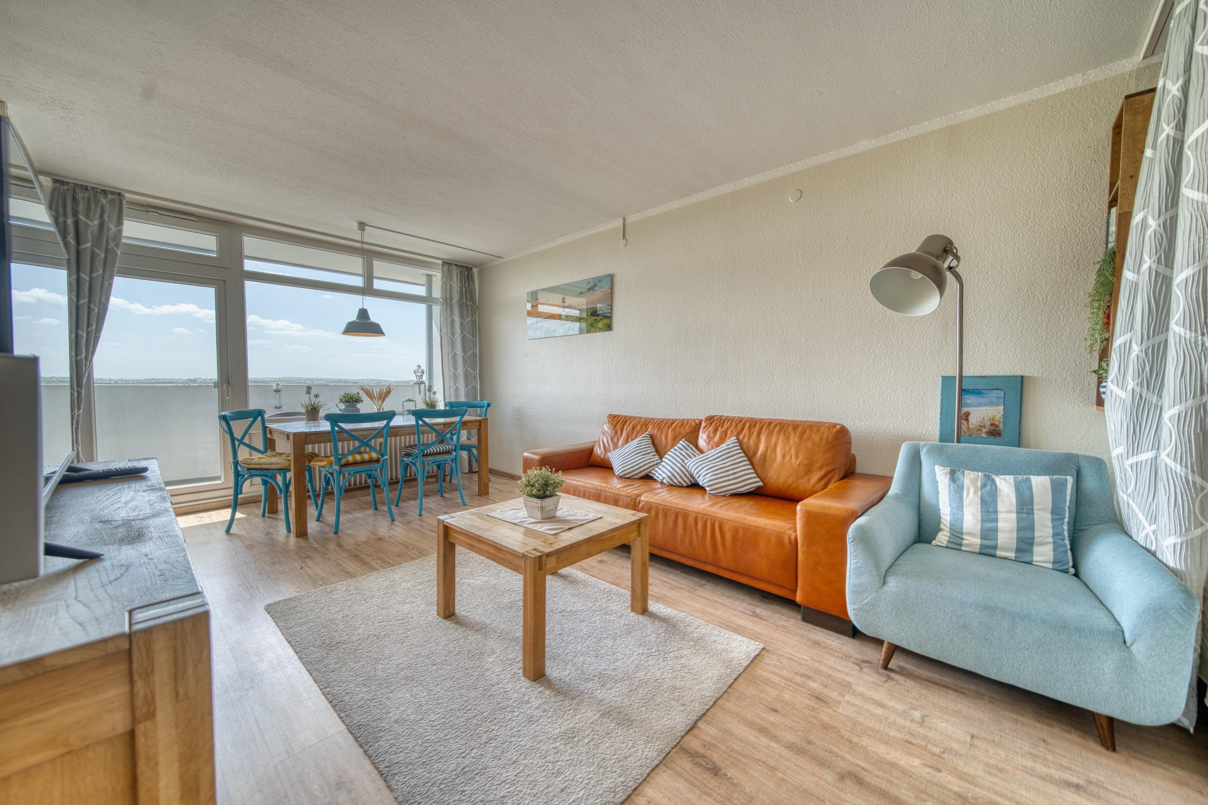 Wohnbereich mit Sofa, Flachbild-TV und Esstisch mit Blick auf den Balkon