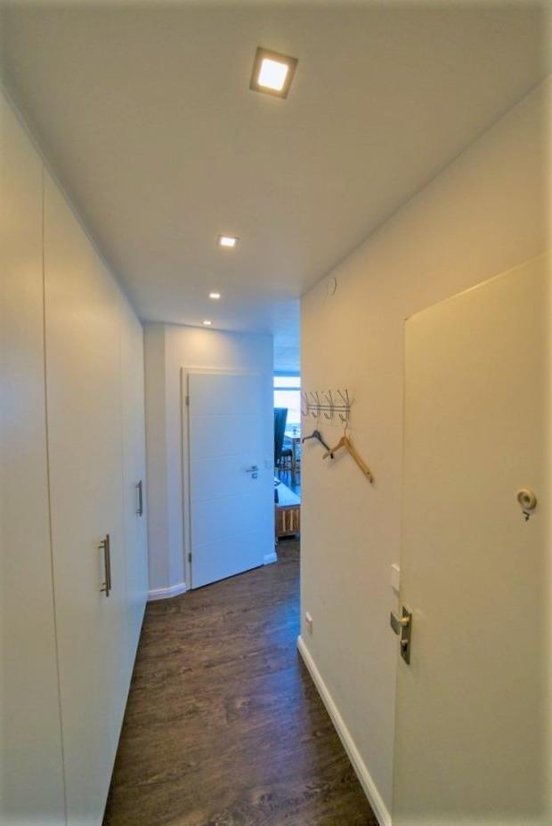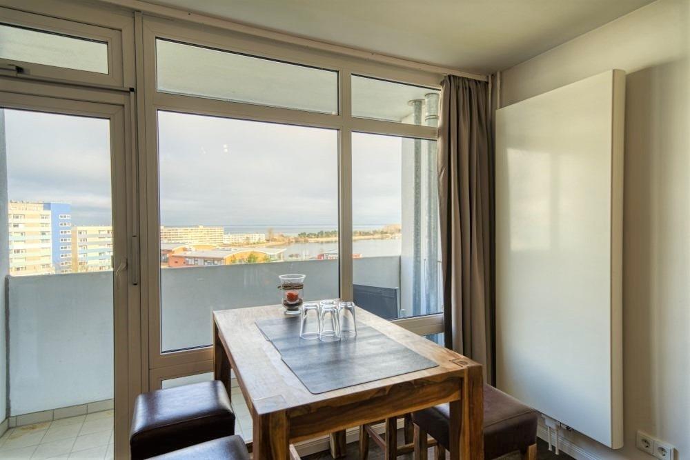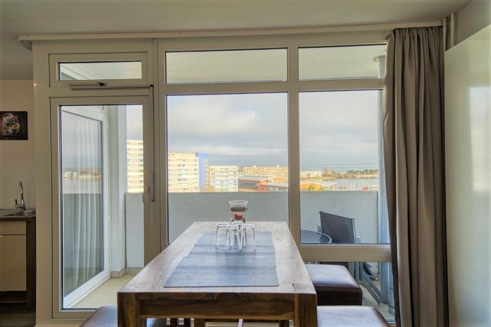Die Wohnung liegt im Haus K Ferienpark, in der 8. Etage, mit Balkon zum Innenhof, der einen schönen Blick auf die Grünanlagen und die Ostsee Richtung Fehmarn bietet.