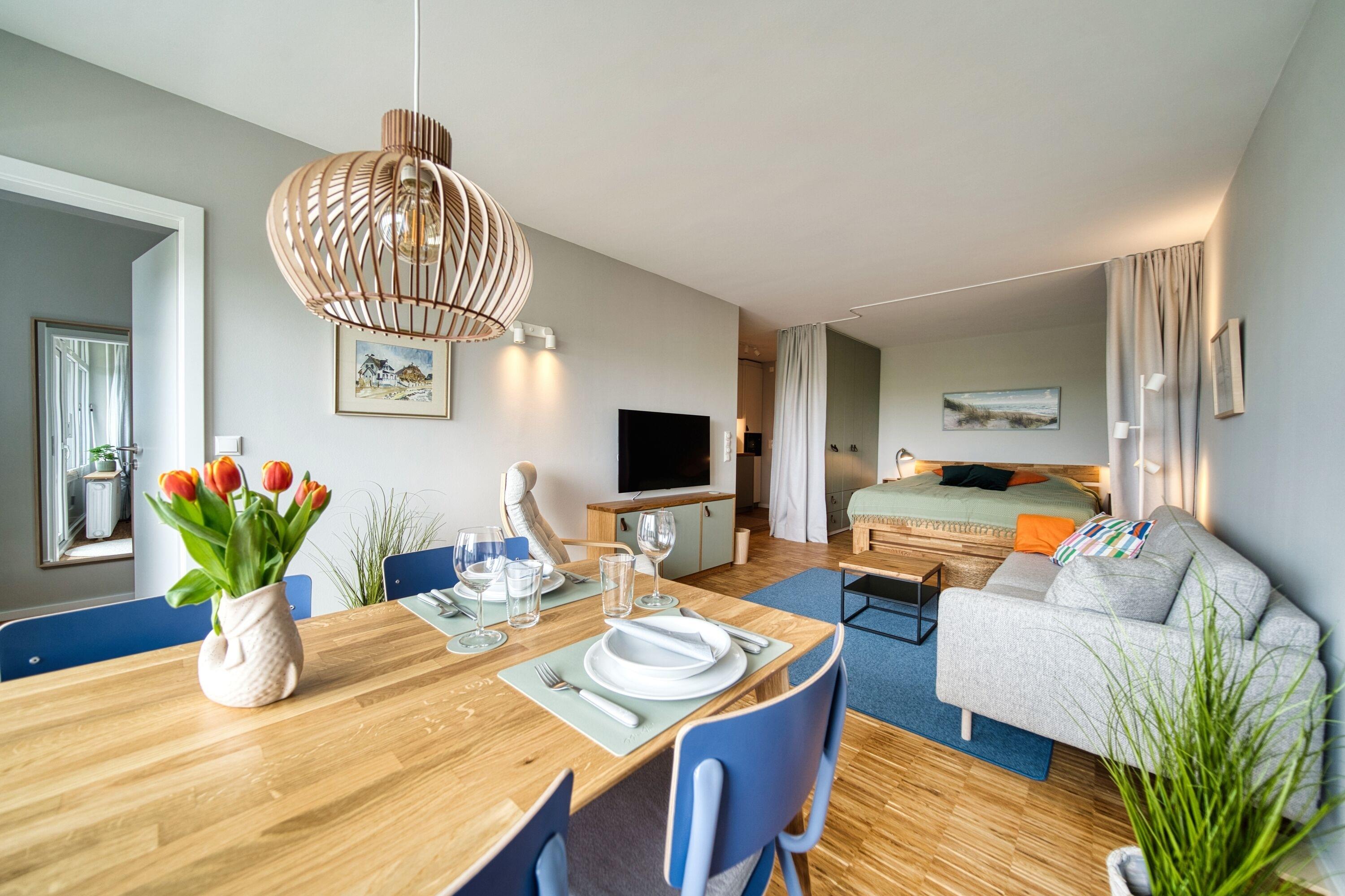 Der Wohnbereich bietet alles, was Sie für einen entspannten Abend benötigen. Ein Smart TV mit Schwenkoption sorgt für bequemes Fernsehen aus jedem Winkel der Wohnung. Hier können Sie nach einem erlebnisreichen Tag an der Ostsee zur Ruhe kommen.