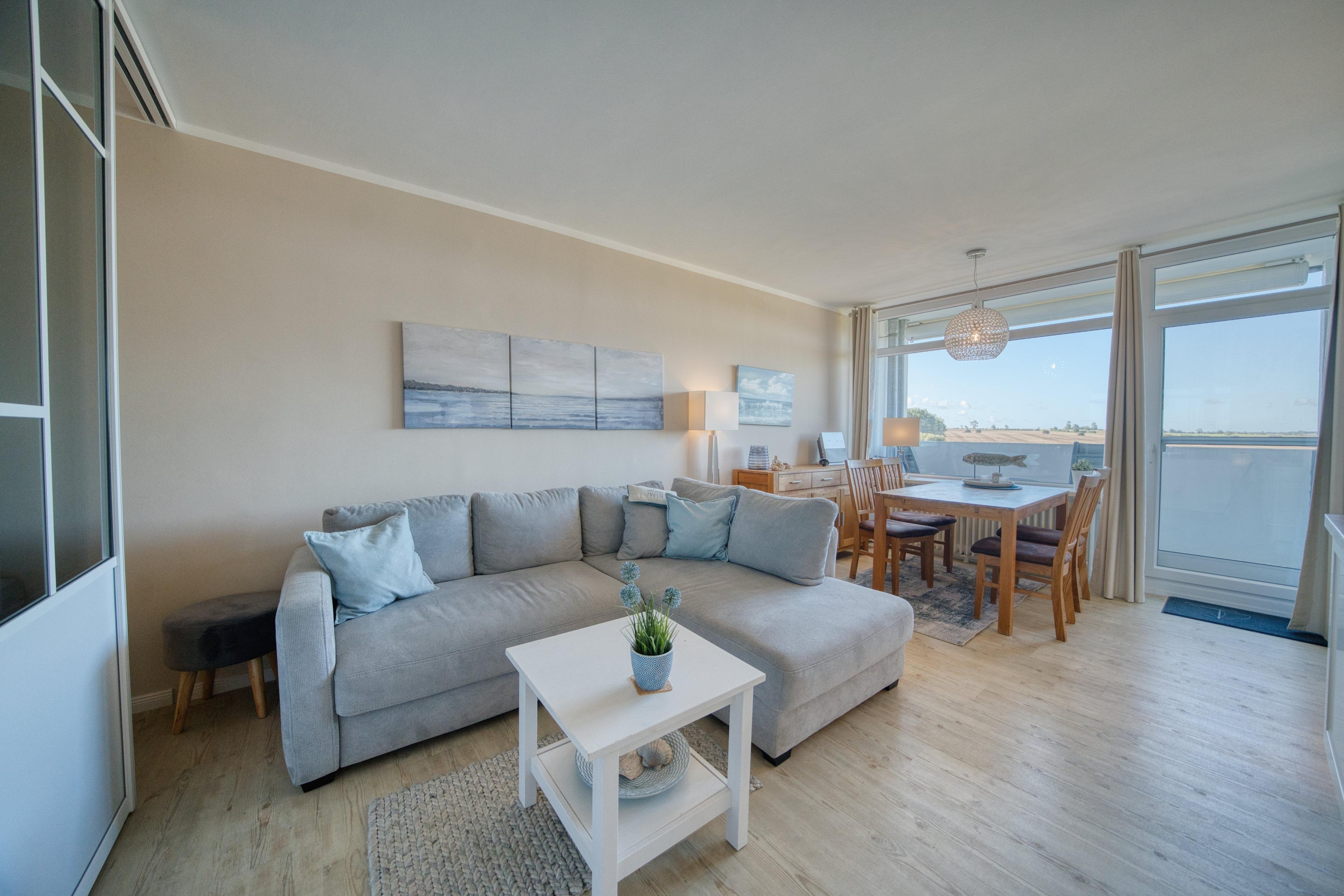 Wohn-Esszimmer mit Eckcouch, Esstisch vor dem Balkon, Flachbild-TV, Radio und Vinylboden