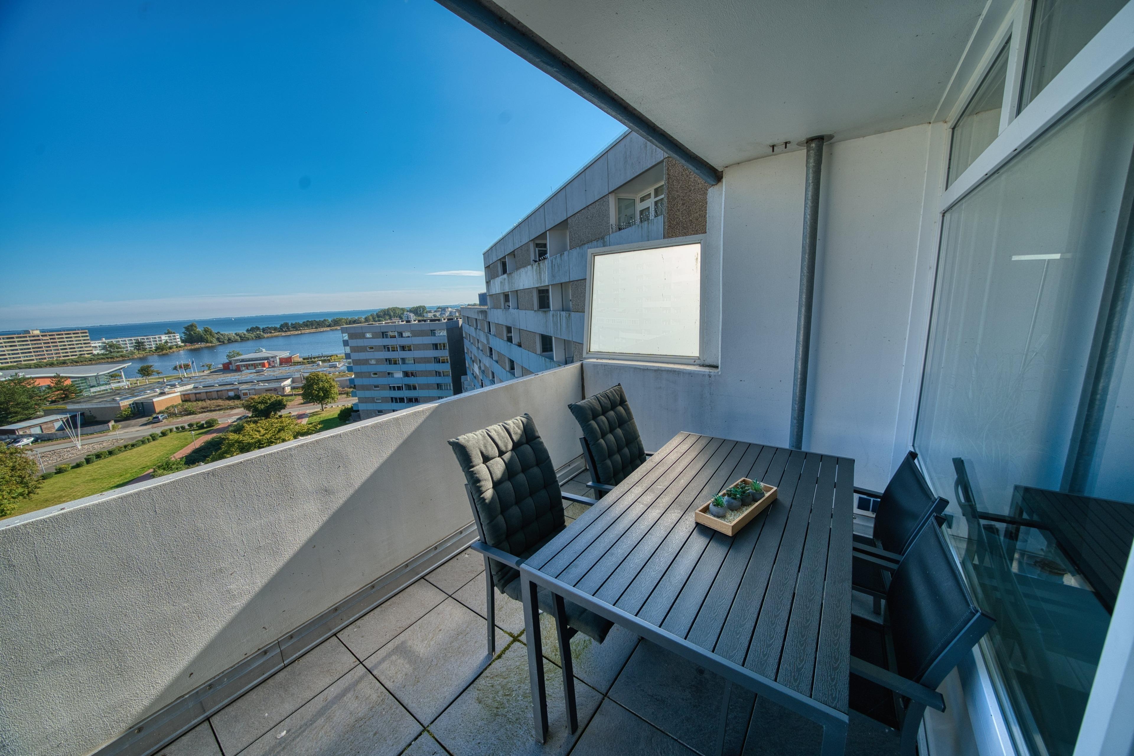 Großer Balkon mit Meerblick – über den Innenhof hinweg bis zur Ostsee