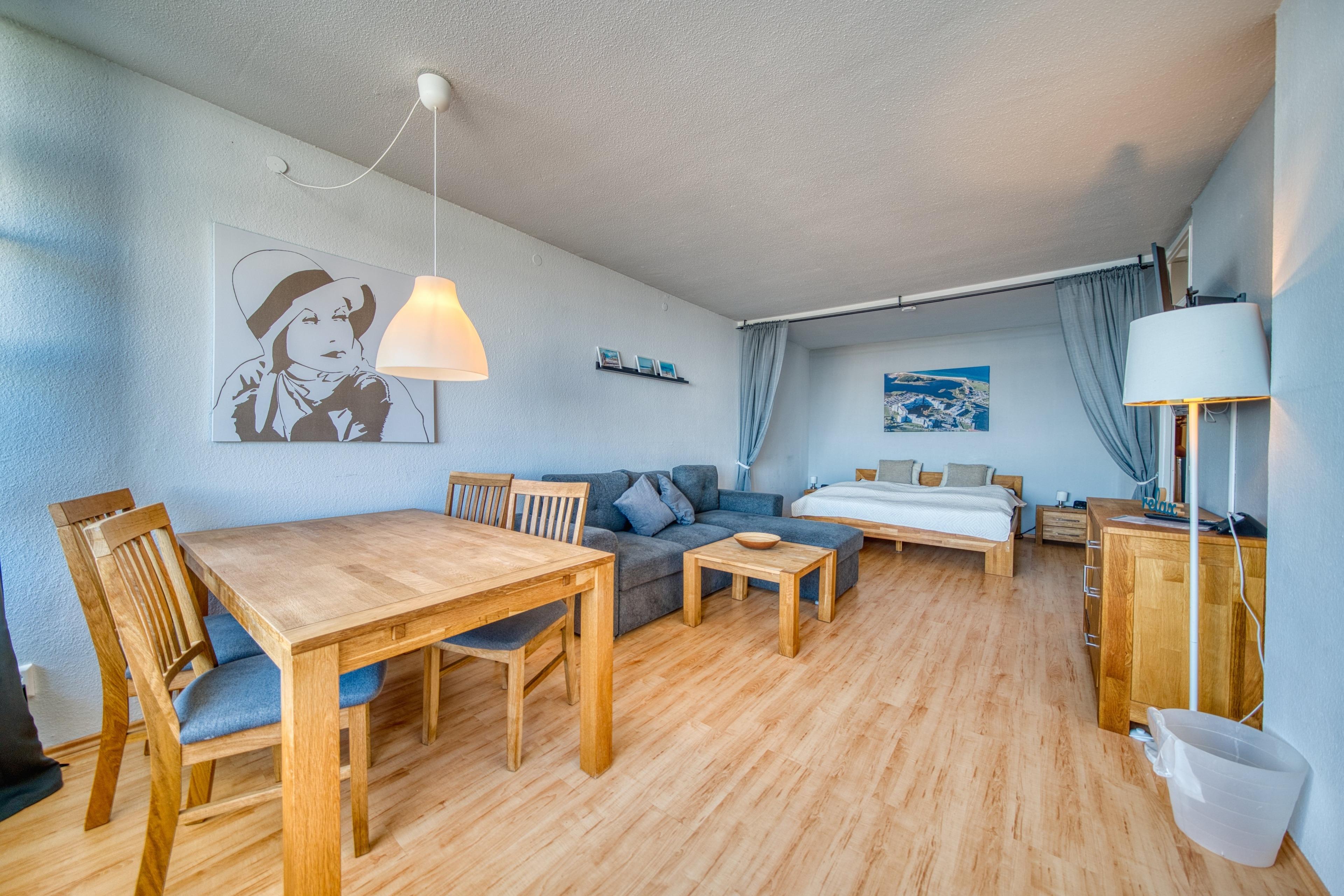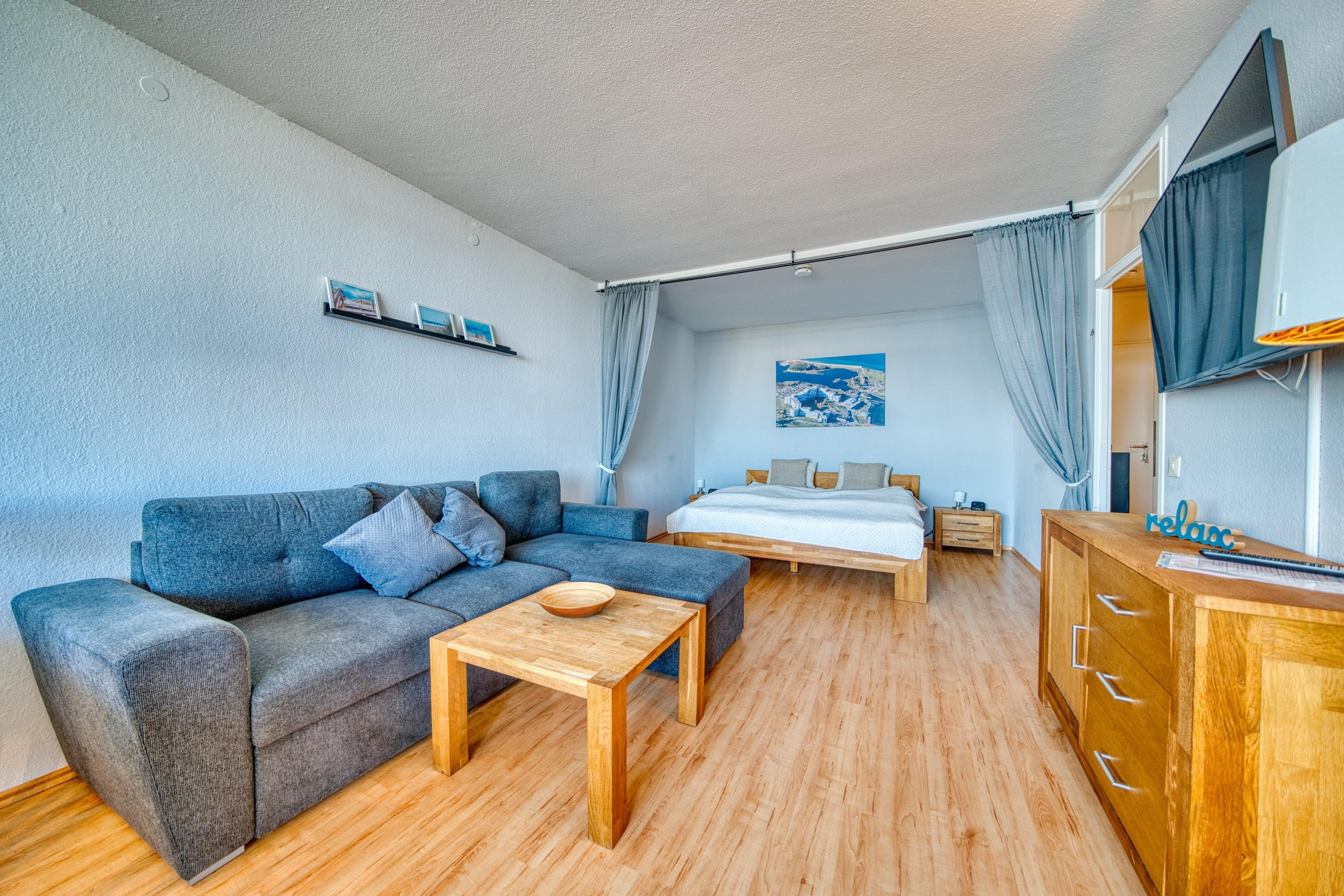 Wohn-Schlafzimmer mit Doppelbett, Eckcouch, Esstisch vor dem Balkon und Flachbild-TV