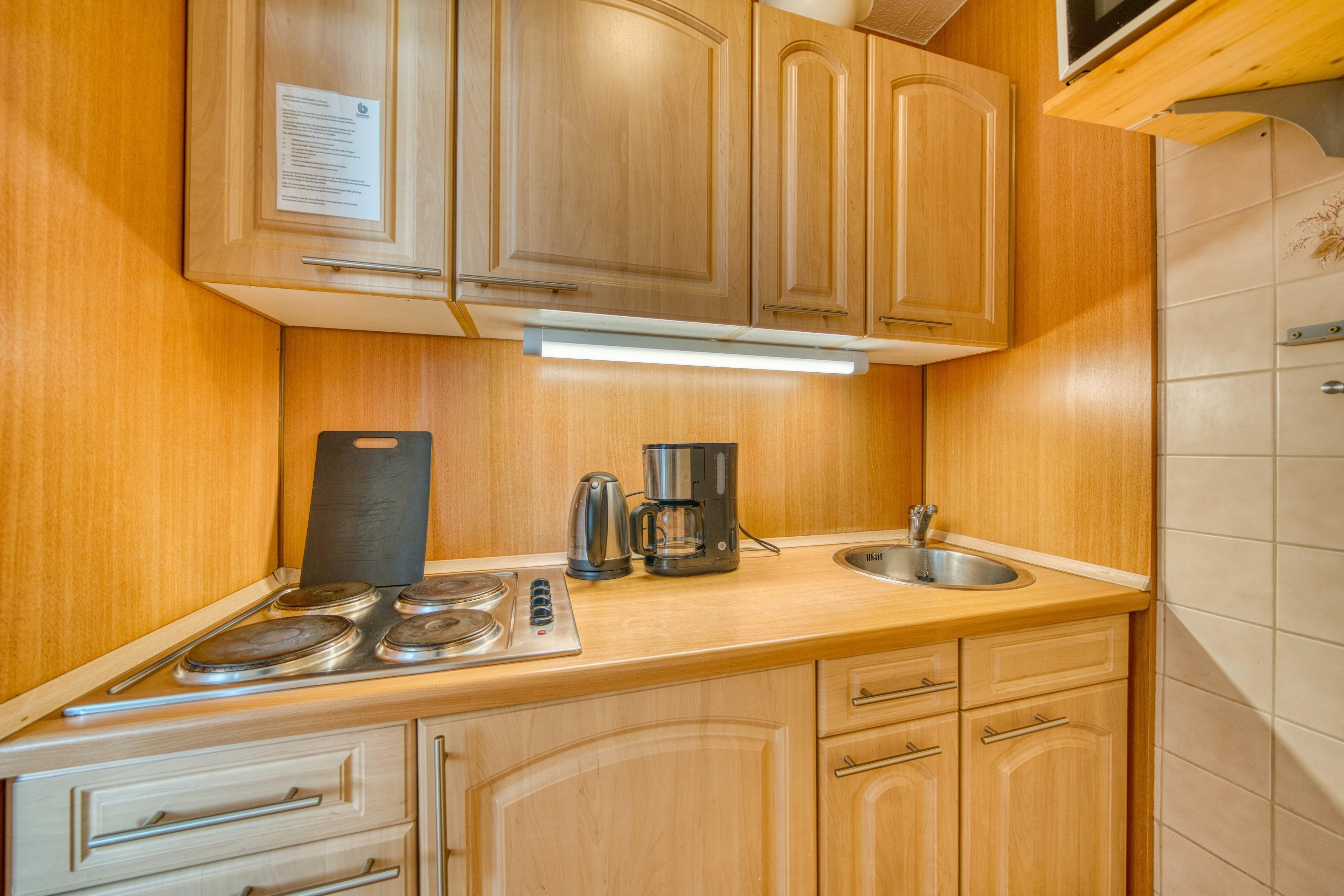 Küche mit praktischer Ausstattung: 4-Plattenherd, Kühlschrank mit Gefrierfach, Mikrowelle, Wasserkocher und Filterkaffeemaschine