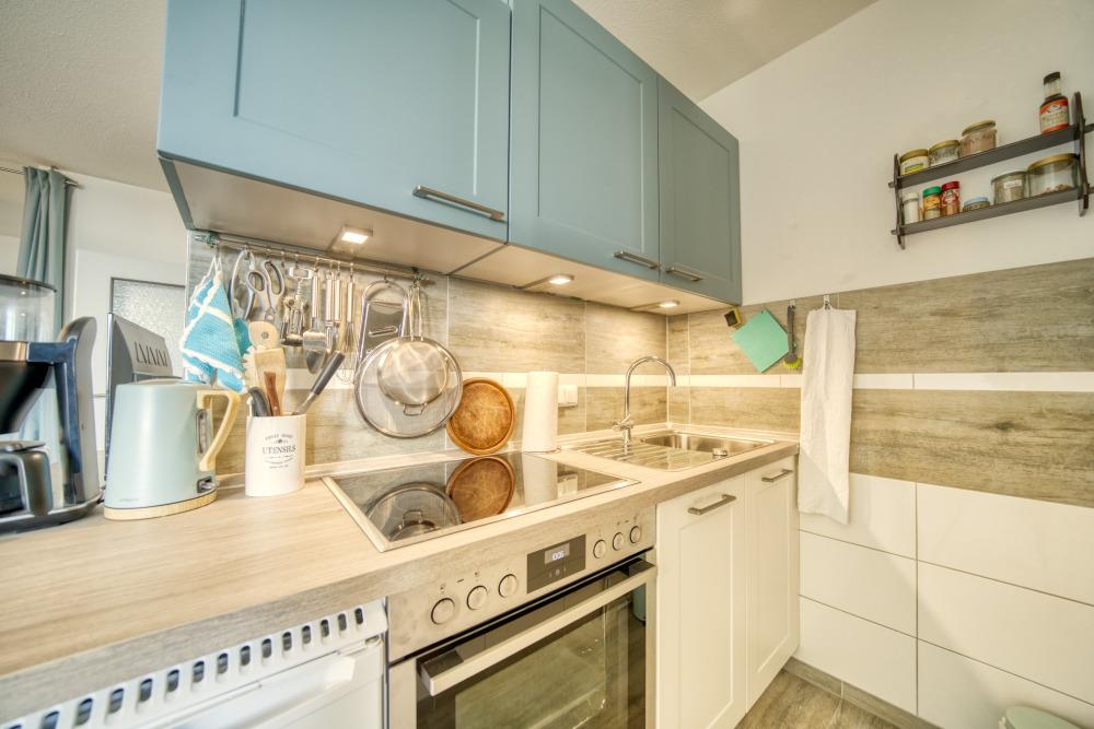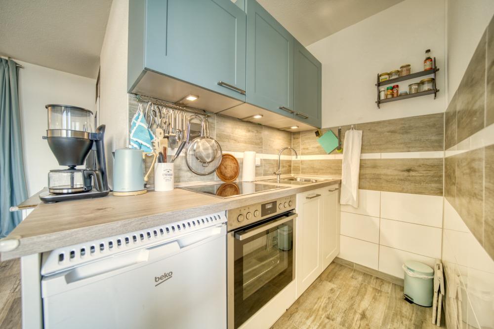 Voll ausgestattete Küche mit Kühlschrank + Gefrierfach, 4-Plattenherd, Geschirrspüler
