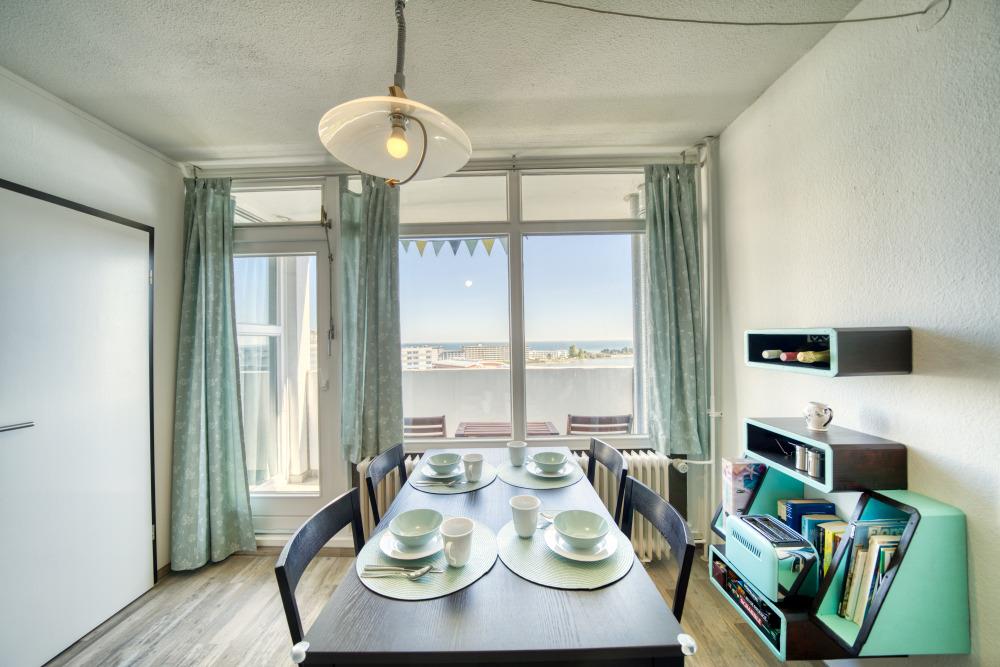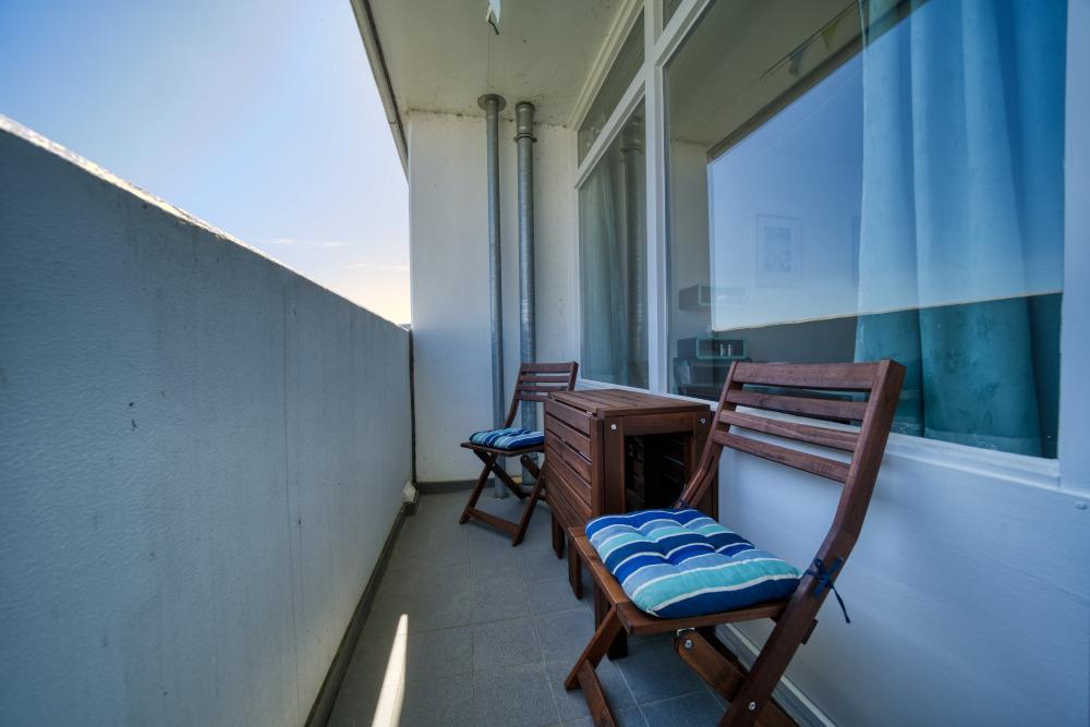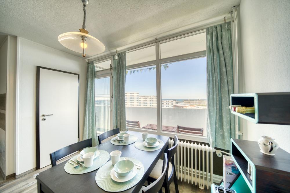 Die Wohnung liegt im Haus L Ferienpark, in der 9. Etage, mit Balkon zum Innenhof, der einen schönen Blick auf die Grünanlagen und die Ostsee Richtung Fehmarn bietet.