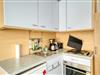 Komplett eingerichtete Küche mit Kühlschrank + Gefrierfach, 4-Platten-Herd, Backofen