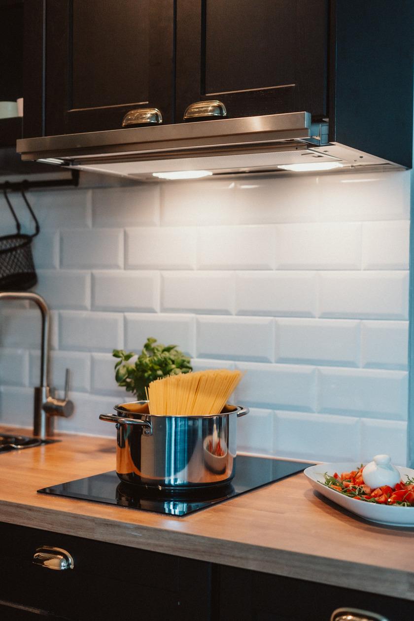 2-Platten-InduktionsherdBackofenKühlschrank mit GefriermöglichkeitKaffeemaschine, Toaster, Wasserkocher