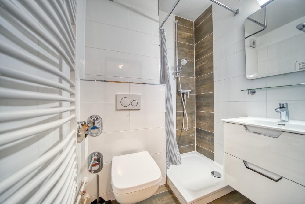 Modernes Badezimmer mit Dusche (niedriger Einstieg), WC und Handtuchtrockner