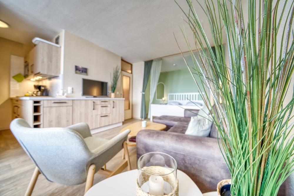 Wohn-Schlafbereich mit Doppelbett, gemütlicher Eckcouch, Esstisch vor dem Balkon und Flachbild-TV