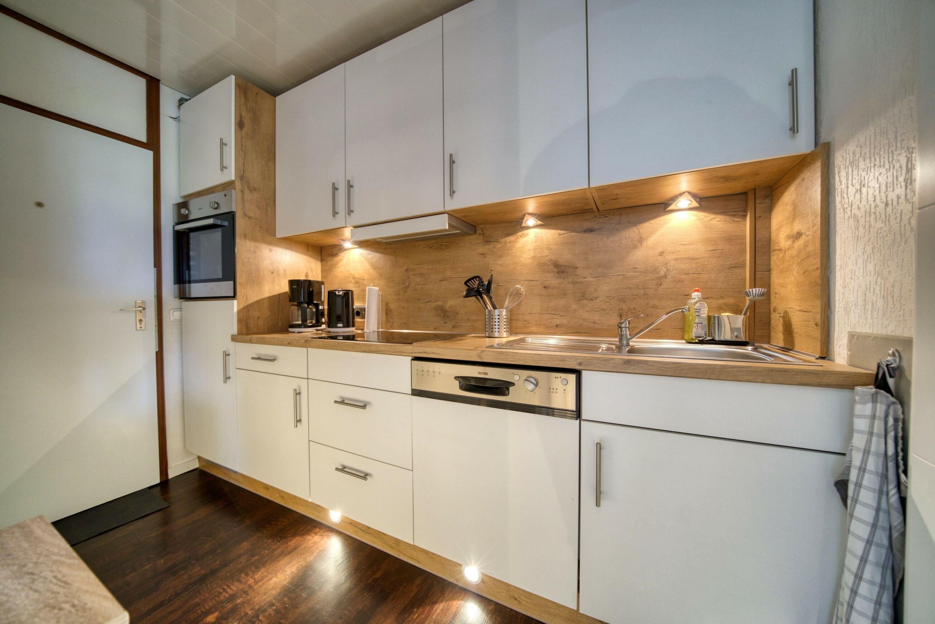 Komplett eingerichtete Küche mit Geschirrspüler, Backofen, 4-Platten-Ceranfeld, Spüle, Kühlschrank mit Gefrierfach und Kaffeemaschine