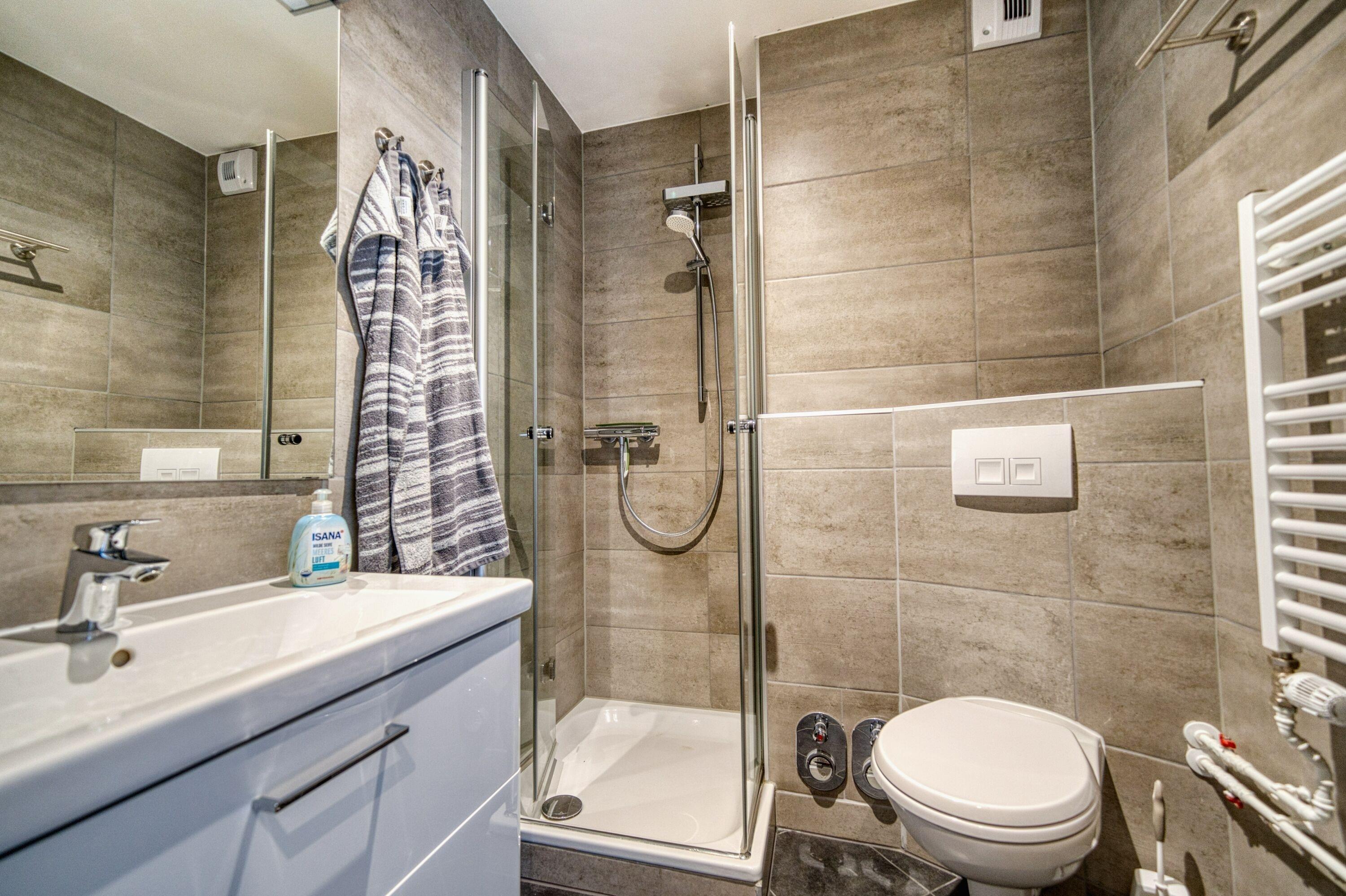 Das geflieste Badezimmer ist funktional und modern gestaltet. Es verfügt über eine geräumige Duschkabine, einen Handtuchtrockner sowie zeitlose Badkeramik – perfekt für einen frischen Start in den Tag.