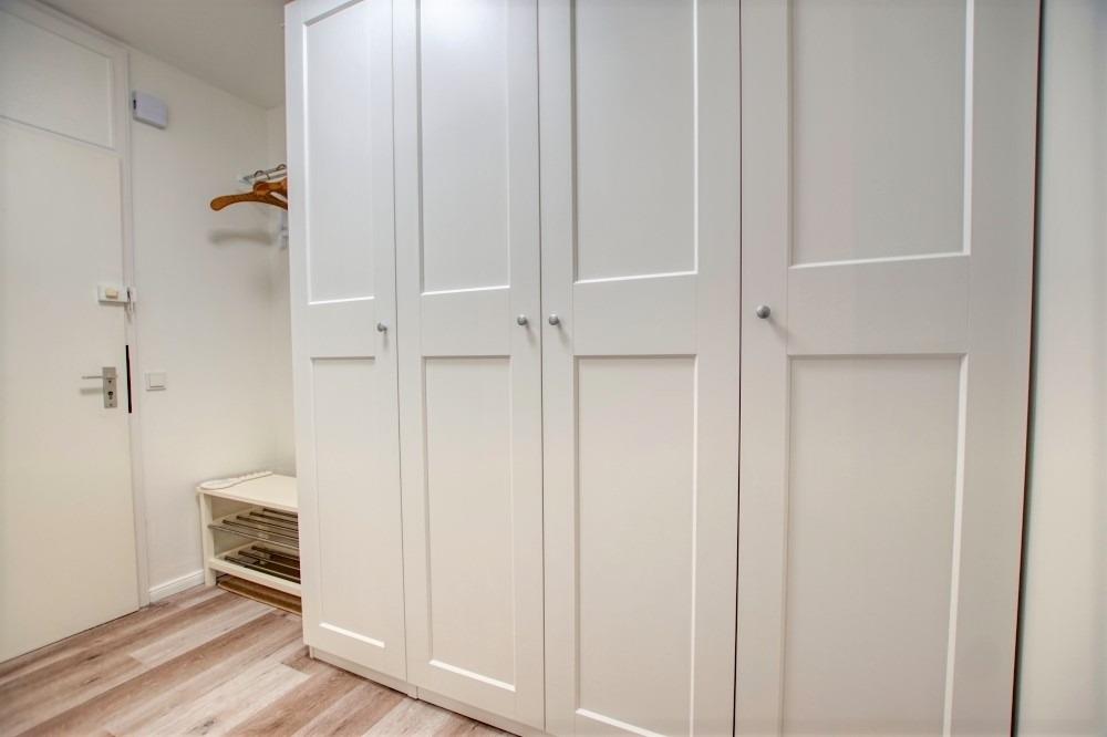 Beim Betreten der Wohnung gelangen Sie in den großzügigen Flur mit Garderobe und großem Einbauschrank. Von hier aus erreichen Sie das modern geflieste Bad mit Duschkabine und den offenen, hell gestalteten Wohnbereich.