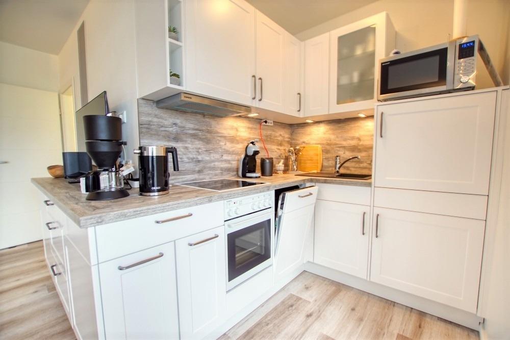 Der Wohnbereich ist mit einer bequemen Ledergarnitur, einem Flachbild-TV und einer Stereoanlage ausgestattet. Ein Essbereich lädt zum gemeinsamen Essen ein. Die hochwertig ausgestattete Küche bietet: